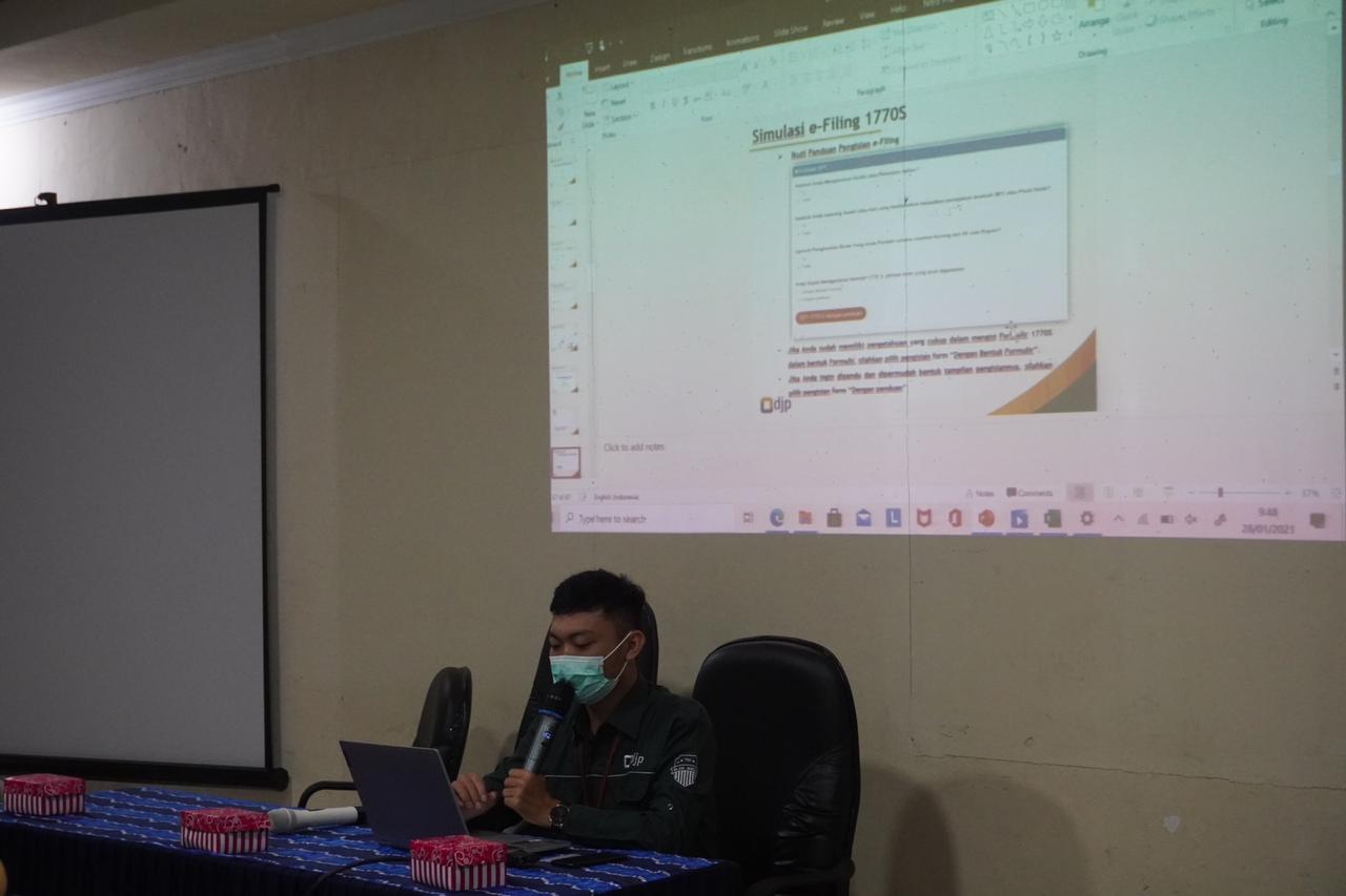 Acara dilanjutkan dengan pre-test terkait pelaporan SPT secara elektronik dan kemudian penyampaian materi serta tata cara penginputan SPT dengan bukti potong 1721 oleh Argenta, staf penyuluh KP2KP Martapura, yang diikuti oleh para peserta dengan menggunakan gawai masing-masing.