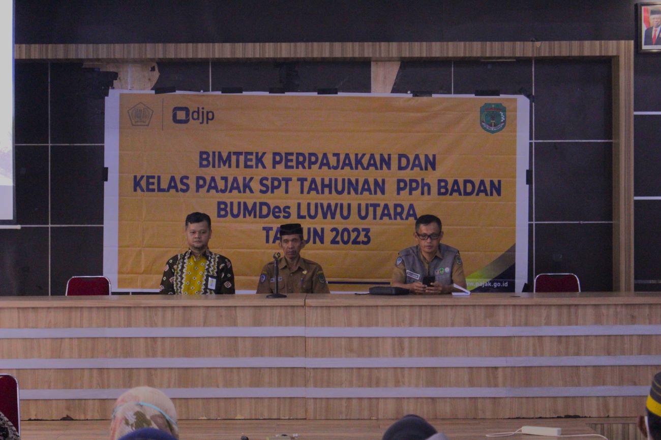Kantor Pelayanan, Penyuluhan, dan Konsultasi Perpajakan (KP2KP) Masamba mengadakan Bimbingan Teknik Perpajakan dan Kelas Pajak Pelaporan Surat Pemberitahuan (SPT) Tahunan untuk Badan Usaha Milik Desa (BUMDes) Luwu Utara (Selasa, 4/4). KP2KP Masamba berkolaborasi dengan Dinas Pemberdayaan Masyarakat Desa (PMD) Luwu Utara untuk mengundang pengurus BUMDes di wilayah Luwu Utara. Sebanyak 53 BUMDes di Wilayah Luwu Utara telah mengirimkan pengurusnya untuk mengikuti kegiatan tersebut. Acara yang dihadiri oleh sejumlah pejabat PMD Luwu Utara tersebut diselenggarakan di Aula Dinas Pendidikan yang berlokasi di Kompleks Perkantoran Masamba, Luwu Utara.