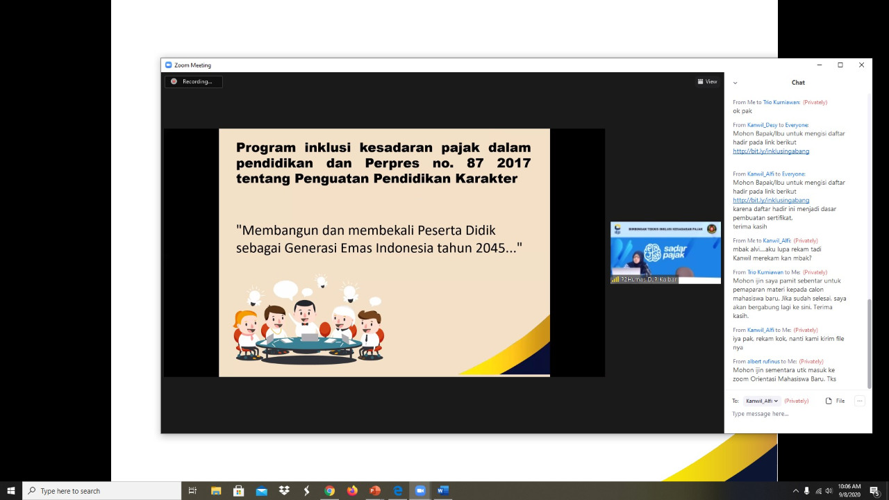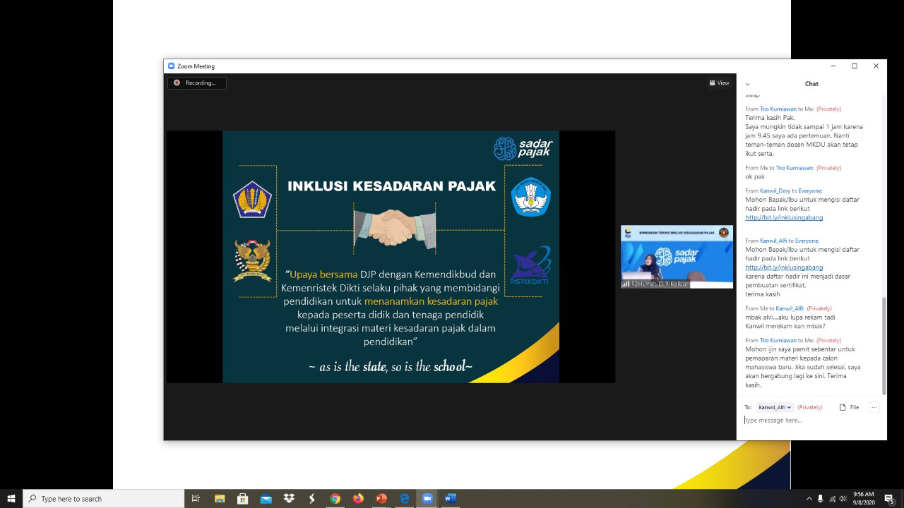 Kepala Seksi Bimbingan Penyuluhan R. Desy Andriyani selaku narasumber mengucapkan terimakasih atas partisipasi aktif dari para dosen yang terlibat dalam webi ini. Desy berujar kegiatan inklusi ini bertujuan agar para dosen dapat mengenalkan pajak kepada para mahasiswa dalam mata kuliahnya. Ia berharap agar semua mahasiswa sebagai generasi penerus bangsa dapat sadar dan taat pajak.