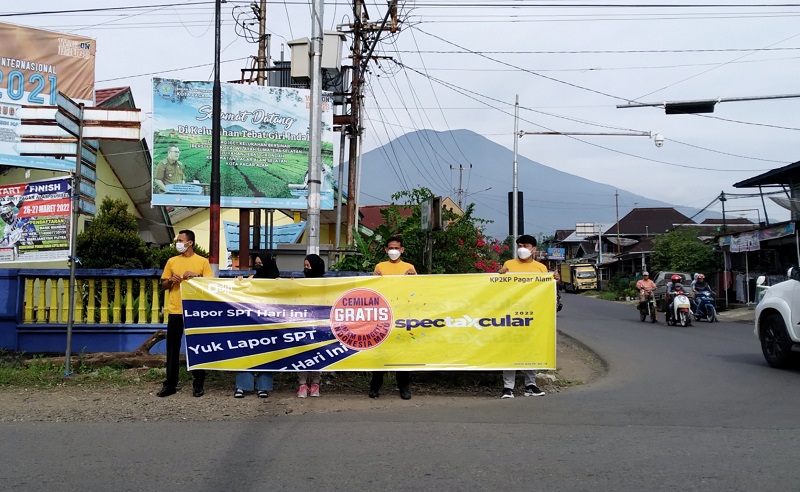 Kantor Pelayanan, Penyuluhan, dan Konsultasi Perpajakan (KP2KP) Pagar Alam mengadakan kegiatan Spectaxcular tahun 2022 dalam bentuk kampanye simpatik pelaporan SPT Tahunan, dengan cara membagikan salah satu produk Usaha Mikro, Kecil, dan Menengah (UMKM) berupa makanan ringan atau camilan keripik khas masyarakat Gunung Dempo. Kegiatan ini diadakan di Jalan D.I. Panjaitan, Pagar Alam, Sumatera Selatan (Jumat, 25/3).