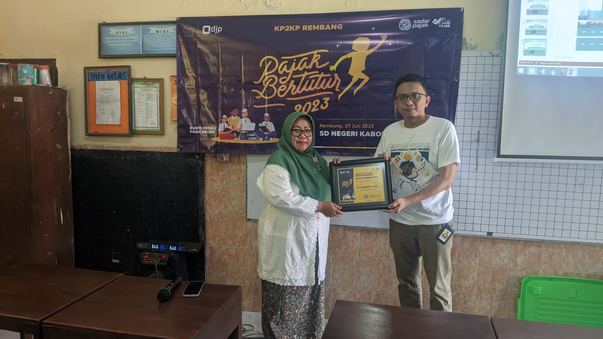 Kantor Pelayanan, Penyuluhan, dan Konsultasi Perpajakan (KP2KP) Rembang melaksanakan Pajak Bertutur di Sekolah Dasar Negeri (SDN) Kabongan Kidul, Rembang (Kamis, 27/7).