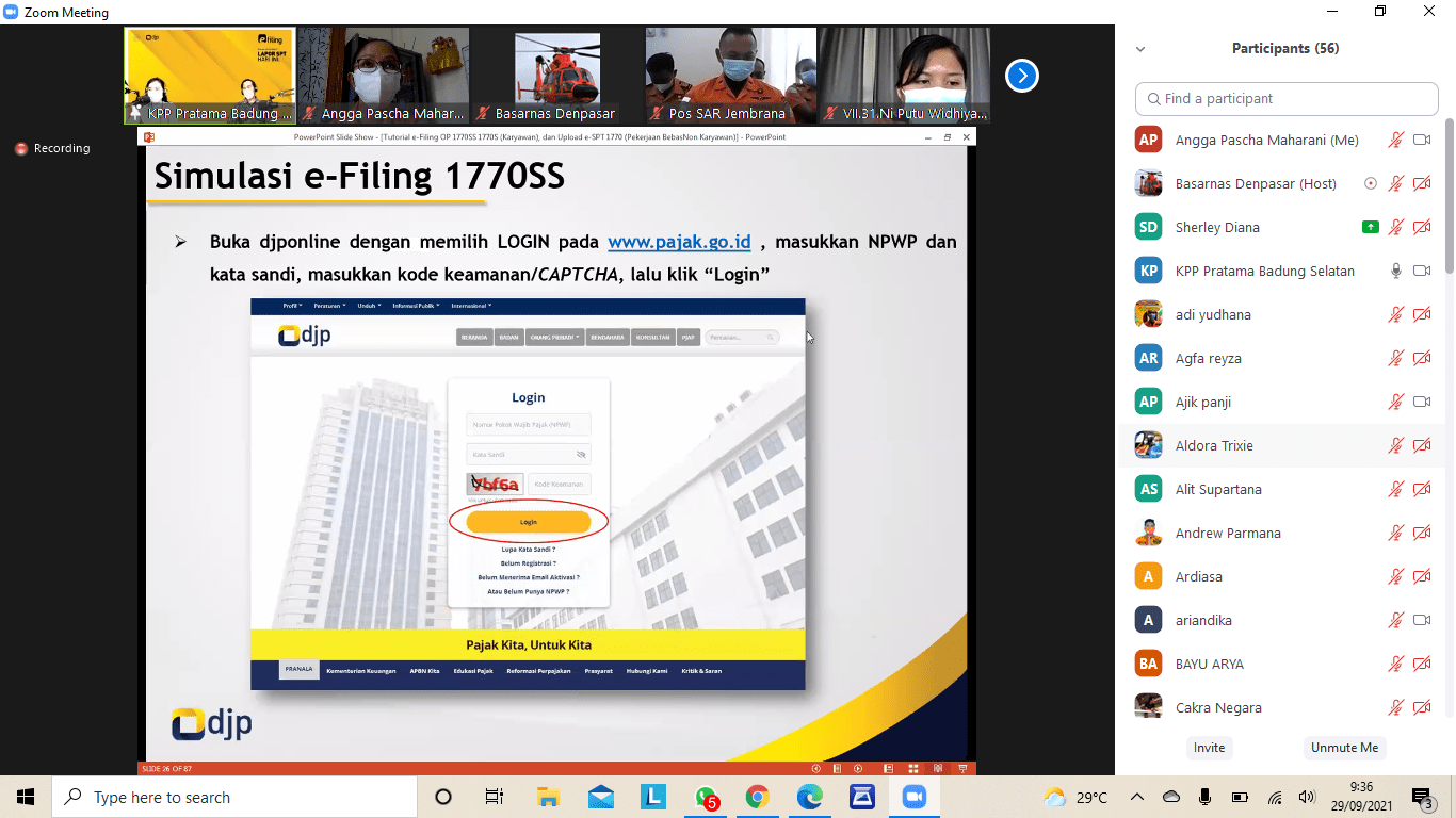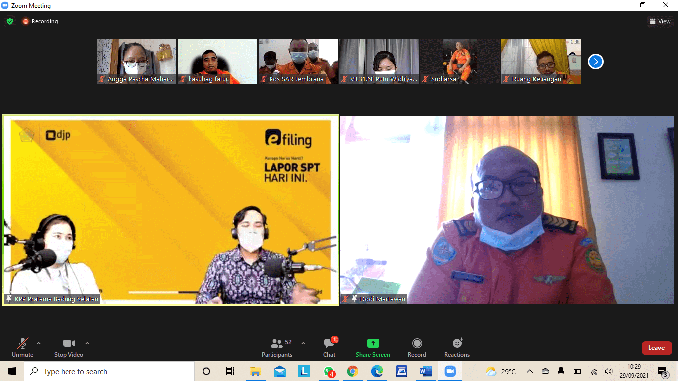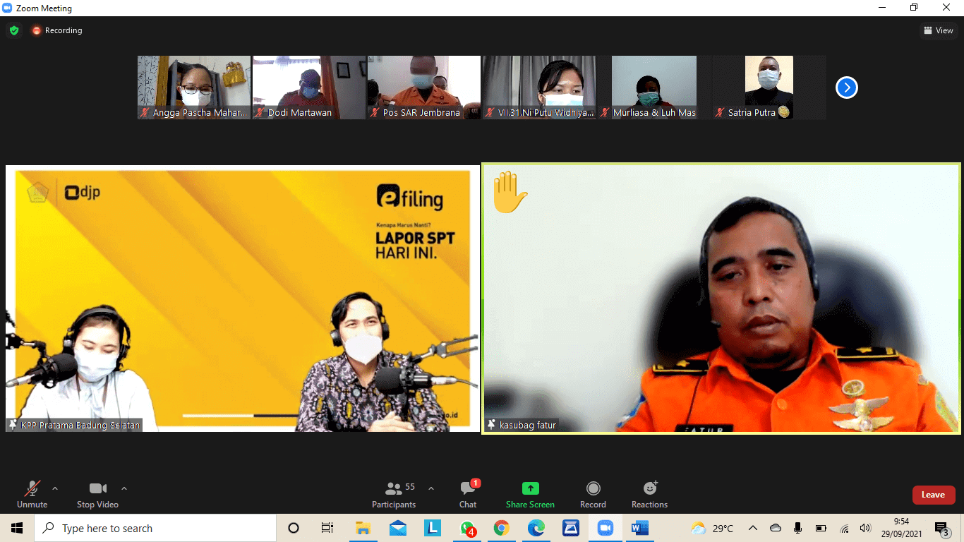 Kegiatan tersebut dilaksanakan secara daring melalui Zoom Cloud Meeting. Adapun peserta kelas pajak online tersebut dihadiri oleh 54 Karyawan SAR Denpasar dengan narasumber fungsional penyuluh pajak KPP Pratama Badung Selatan yaitu Lalu Mohammad Ramdi dan Sherley Diana Thandung.