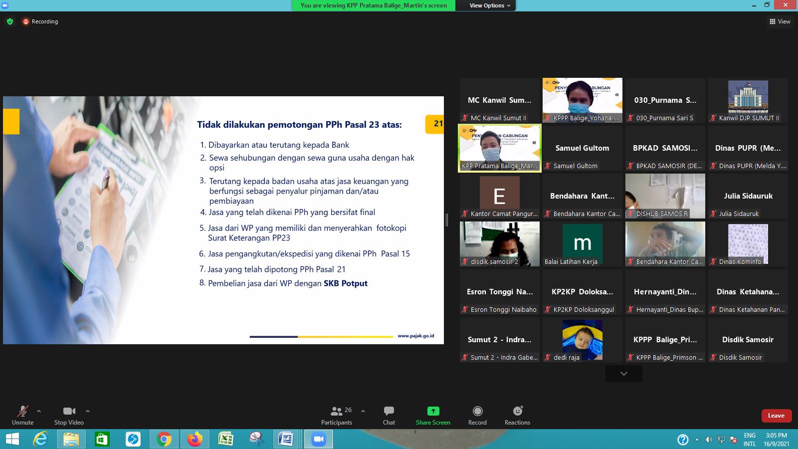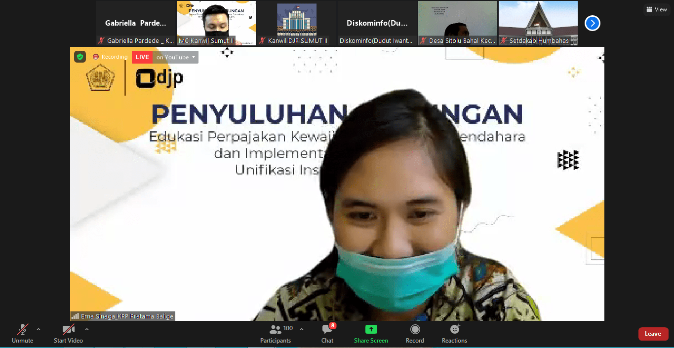 Kantor Pelayanan Pajak (KPP) Pratama Balige juga mengadakan sosialisasi mengenai Surat Pemberitahuan (SPT) Unifikasi dan Edukasi Kewajiban Perpajakan oleh Bendahara Instansi bersama instansi-instansi yang berada di bawah wilayah Kabupaten Samosir dan Humbang Hasundutan secara daring dari KPP Pratama Balige, Kabupaten Toba Samosir, Sumatera Utara (Selasa, 21/9).