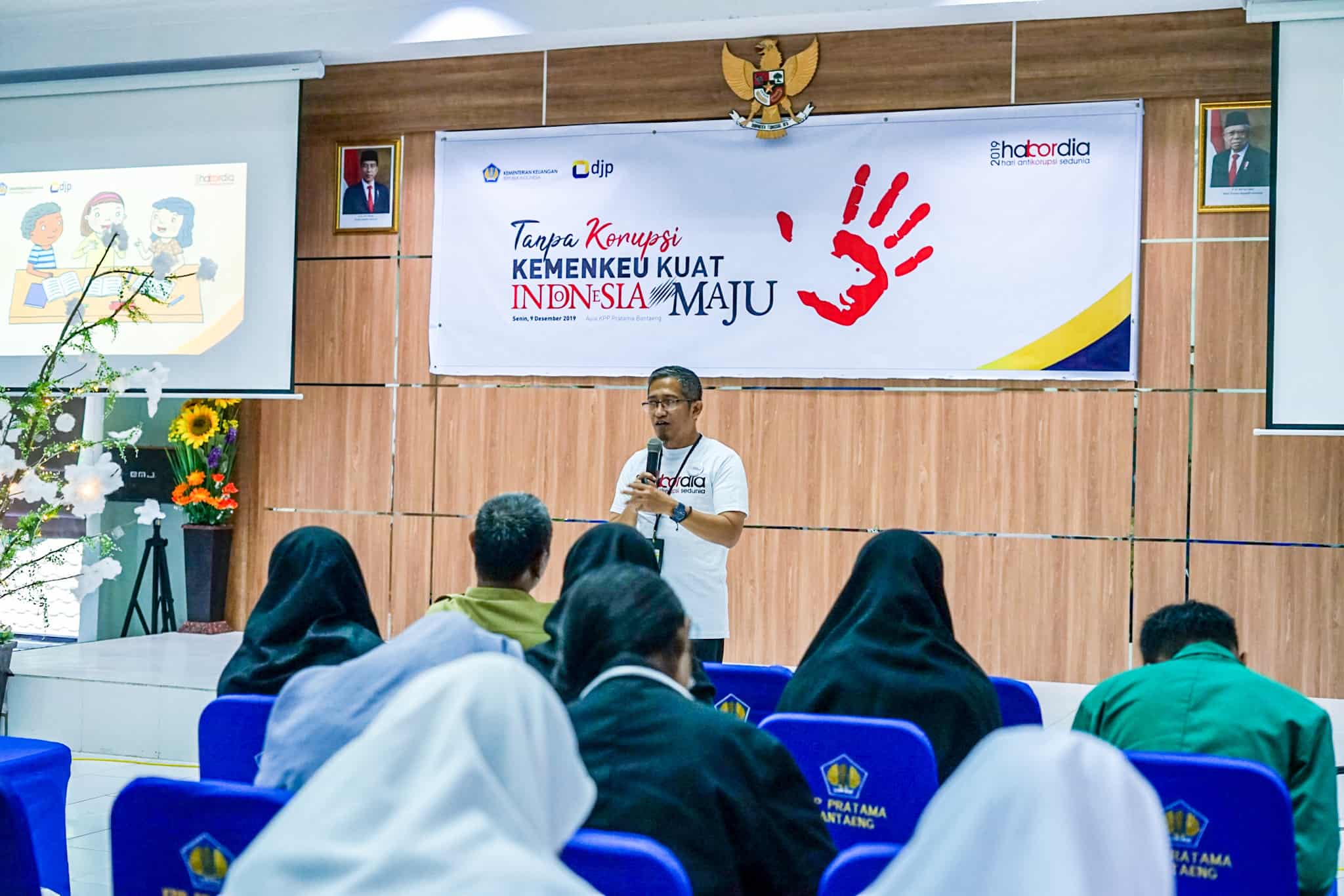 Dalam rangka memperingati Hari Antikorupsi Sedunia (Hakordia) yang jatuh pada tanggal 9 Desember, Kantor Pelayanan Pajak (KPP) Pratama Bantaeng mengadakan kegiatan Sosialisasi Antikorupsi sekaligus Pengumuman Pemenang Lomba Video Antikorupsi tingkat SMA se-Kabupaten Bantaeng (Senin, 9/12). Kegiatan ini digelar di Ruang Aula KPP Pratama Bantaeng dengan dihadiri oleh perwakilan siswa-siswi dan para guru pendamping dari 8 siswa SMA dan SMK se-Kabupaten Bantaeng.