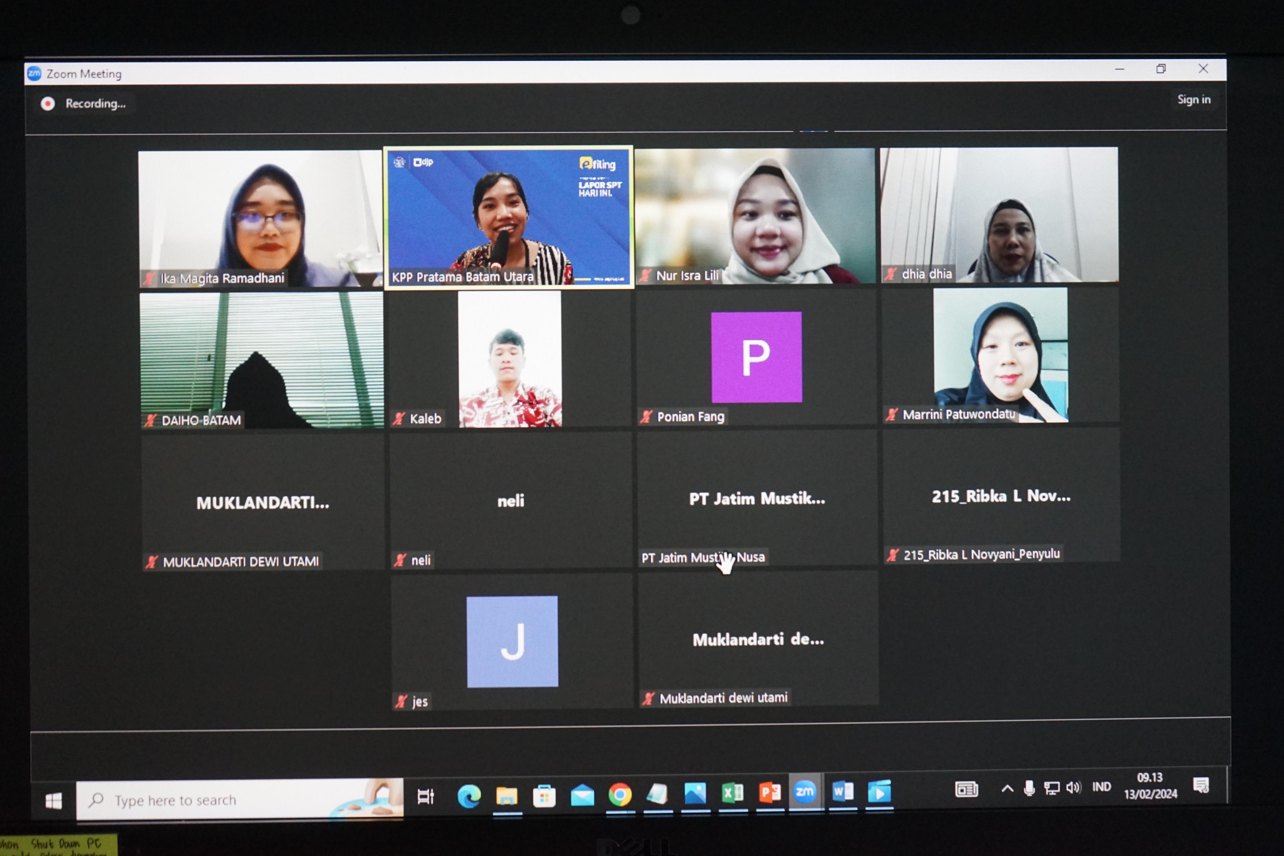 Kantor Pelayanan Pajak (KPP) Pratama Batam Utara mengadakan kelas pajak tentang penerapan Peraturan Pemerintah (PP) Nomor 58 Tahun 2023 dan Peraturan Menteri Keuangan (PMK) Nomor 168 Tahun 2023 secara daring di Kota Batam, Kepulauan Riau (Selasa, 13/2). PP dan PMK ini mengatur tentang pemotongan pajak atas penghasilan sehubungan dengan pekerjaan, jasa, atau kegiatan orang pribadi. Kegiatan dipandu oleh Penyuluh Pajak Merita Katrina Sari dan Ribka Linda Novyani, dan diikuti 13 peserta mewakili perusahaannya.