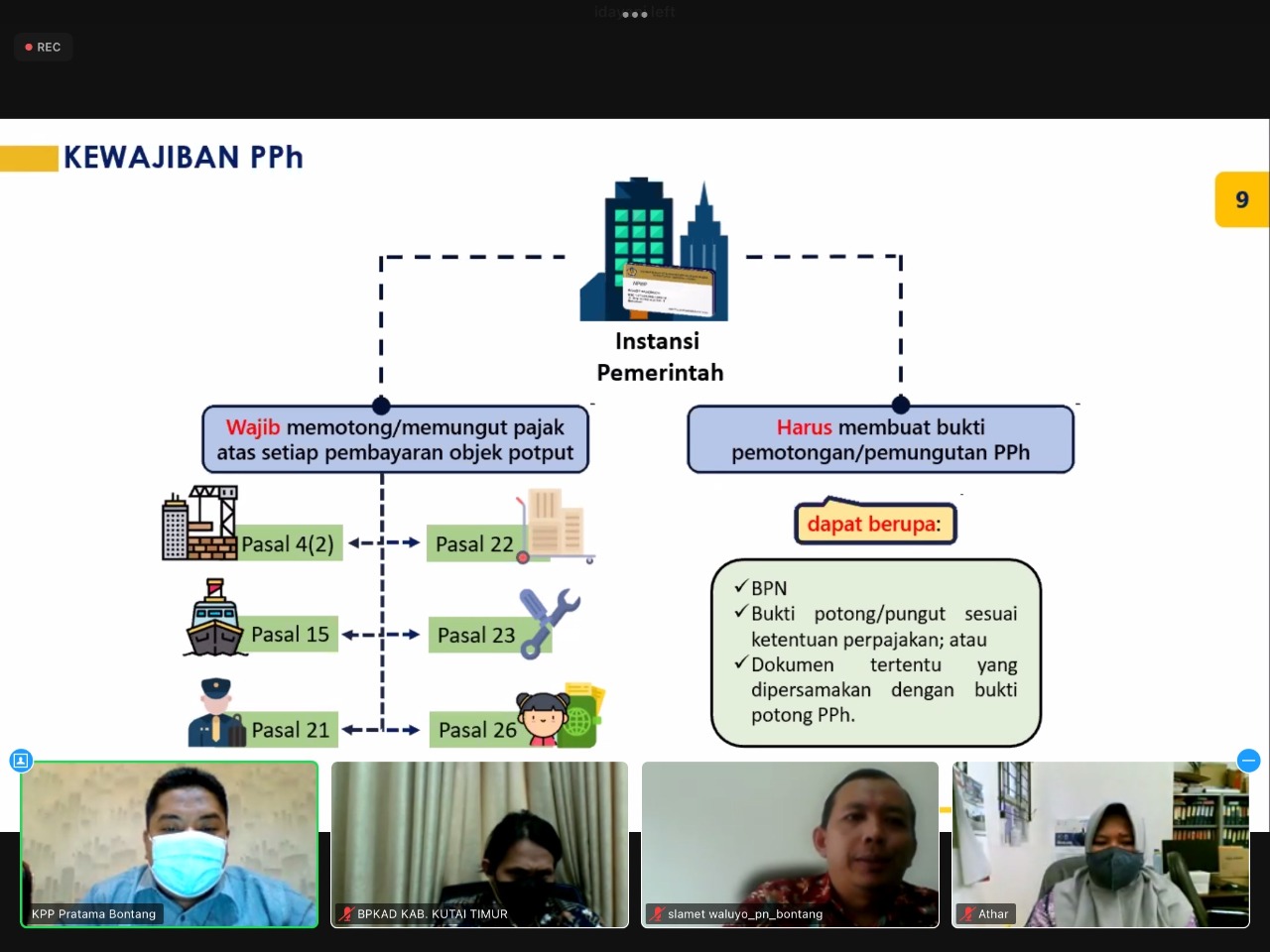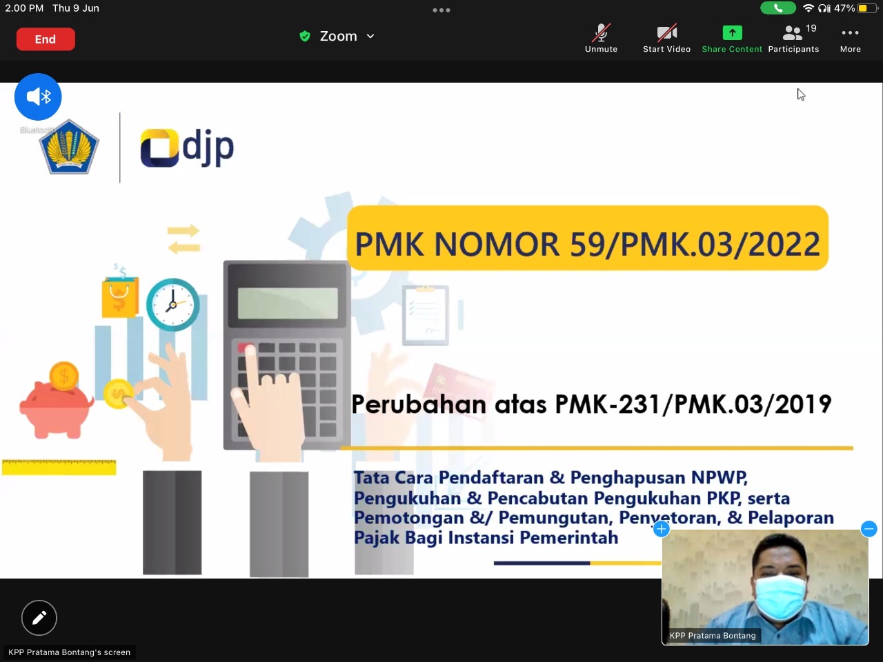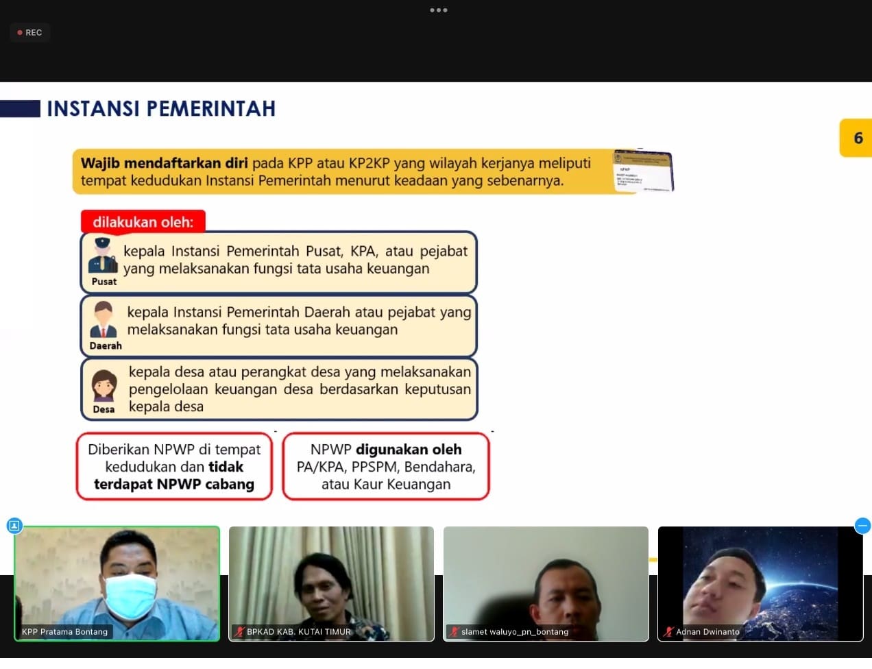 Kantor Pelayanan Pajak (KPP) Pratama Bontang menyelenggarakan kelas pajak Peraturan Menteri Keuangan (PMK) Nomor 59 tahun 2022 tentang tata cara pendaftaran & penghapusan Nomor Pokok Wajib Pajak (NPWP), pengukuhan Pengusaha Kena Pajak (PKP) & pencabutan pengukuhan PKP, serta pemotongan dan atau pemungutan, penyetoran dan pelaporan pajak bagi instansi pemerintah secara daring dari KPP Pratama Bontang, Kota Bontang, Kalimantan Timur (Kamis, 9/6).