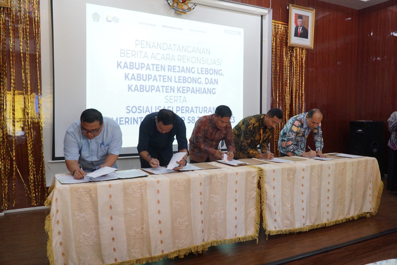 BA Rekon ditandatangani oleh Kepala KPP Pratama Curup Imam Kasro’i, Kepala KPPN Curup Ma’ruf, Kepala Badan Pengelolaan Keuangan Daerah (BPKD) Kabupaten Rejang Lebong Andy Ferdian, Kepala Badan Keuangan Daerah (BKD) Kabupaten Lebong Erik Rosadi, dan Kepala BKD Kabupaten Kepahiang Jono Antoni.