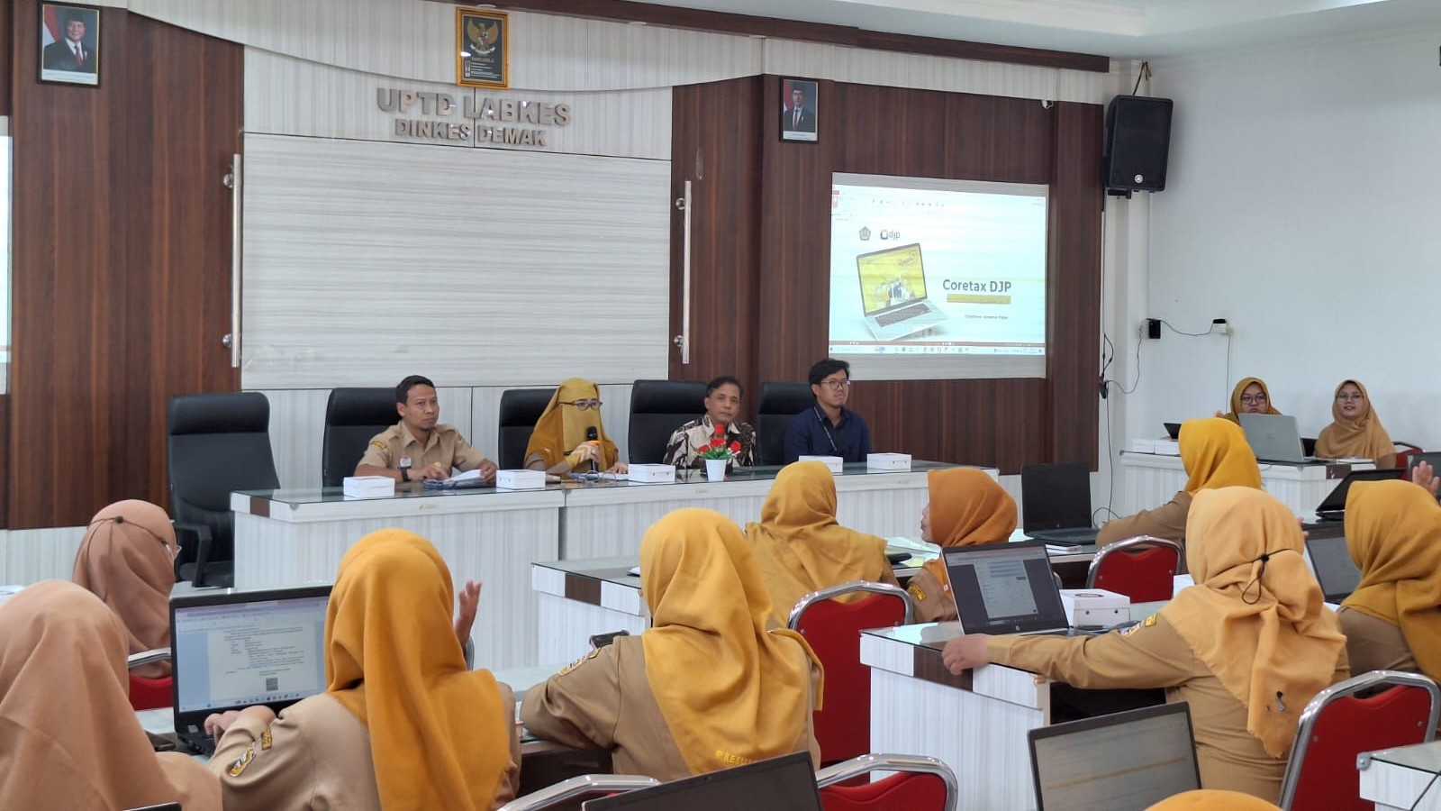 Kantor Pelayanan Pajak (KPP) Pratama Demak bekerja sama dengan Dinas Kesehatan Daerah Kabupaten Demak (Dinas Kesehatan) menyelenggarakan bimbingan teknis aktivasi akun Coretax di Aula Laboratorium Kesehatan Daerah (Labkesda) Kabupaten Demak (Selasa, 2/12). Peserta kegiatan yaitu para pegawai pengelola keuangan perwakilan dari 27 Pusat Kesehatan Masyarakat (Puskesmas), dua Rumah Sakit Umum Daerah (RSUD), dan satu Labkesda di Kabupaten Demak.