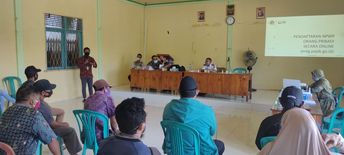 Tim Penyuluh Perpajakan Kantor Pelayanan Pajak (KPP) Pratama Ketapang memberikan sosialisasi pendaftaran Nomor Pokok Wajib Pajak (NPWP) secara daring (online) melalui aplikasi e-Registration di Kantor Desa Siduk, Kayong Utara (Selasa, 10/8).