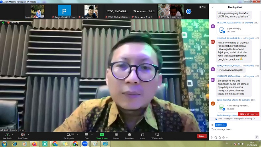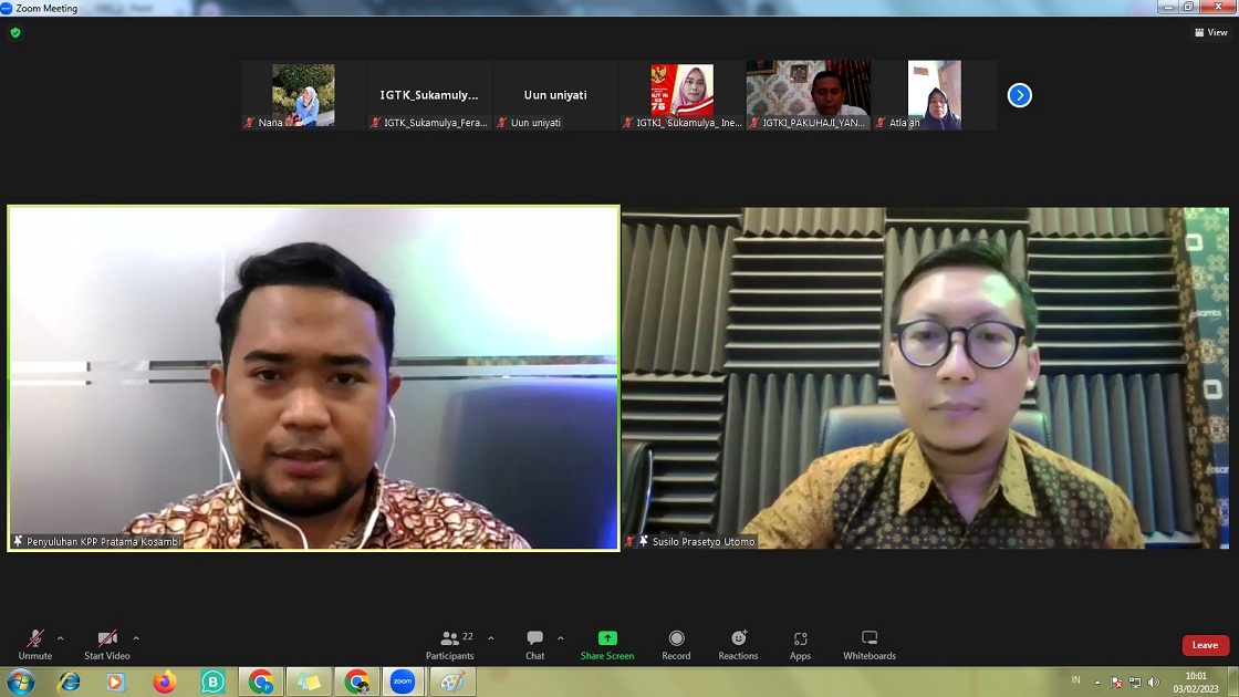 Kelas pajak dilaksanakan secara daring melalui aplikasi Zoom Meeting dan berlangsung mulai pukul 09.00 WIB. Kegiatan ini dipandu oleh Tim Penyuluh Pajak KPP Pratama Kosambi Susilo Prasetyo Utomo dan Moch. Mipta Hudin. Selain penyampaian materi tentang kewajiban pelaporan SPT Tahunan, tim penyuluh juga membuka sesi diskusi dan tanya jawab dengan peserta kegiatan.