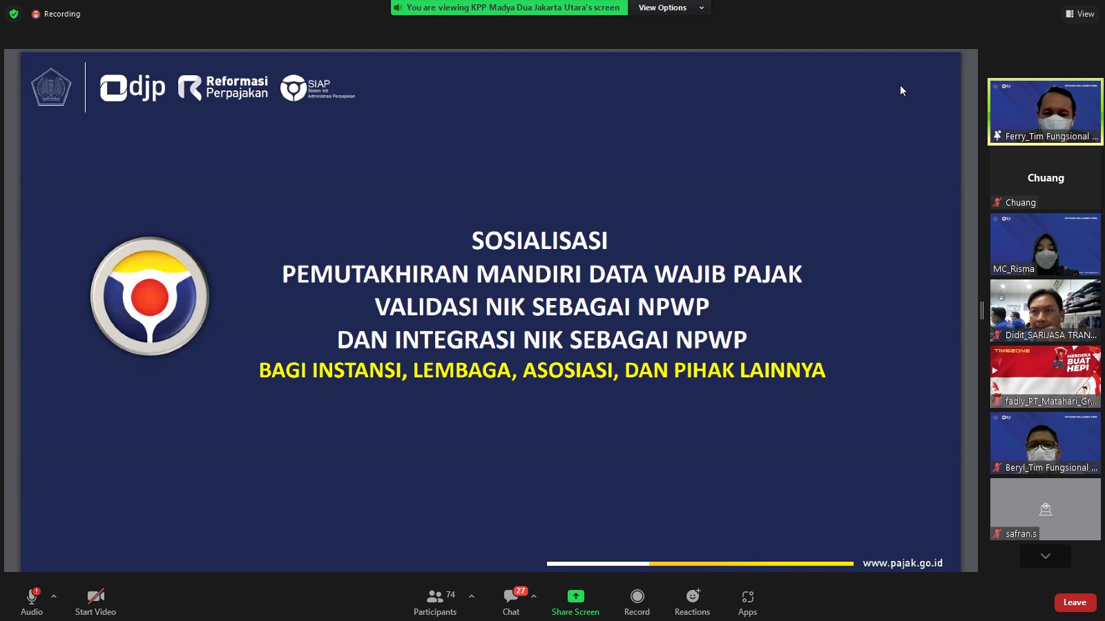 Kantor Pelayanan Pajak (KPP) Madya Dua Jakarta Utara mengadakan kelas pajak terkait pemadanan NIK-NPWP secara daring melalui aplikasi Zoom Meeting dari KPP Madya Dua Jakarta Utara (Rabu, 8/2). Edukasi dilakukan mulai pukul 10.00 sampai 11.30 WIB dan diikuti 62 wajib pajak. Kegiatan dilakukan dalam rangka mempercepat implementasi NIK sebagai NPWP sebagaimana tercantum dalam Peraturan Menteri Keuangan (PMK) Nomor 112/PMK.03/2022.