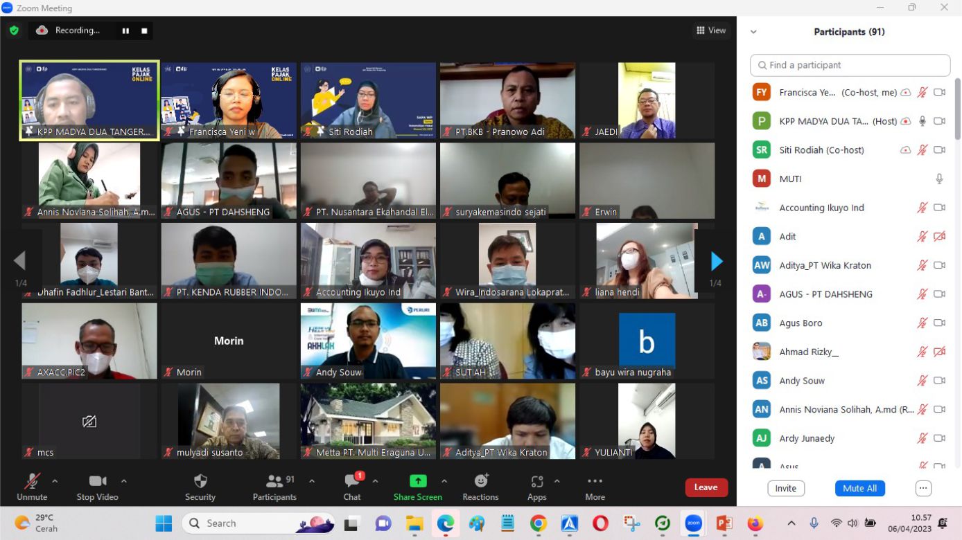 Kantor Pelayanan Pajak (KPP) Madya Dua Tangerang kembali mengadakan kelas pajak dengan sosialisasi pelaporan Surat Pemberitahuan (SPT) Tahunan Badan yang disampaikan oleh Fungsional Penyuluh Pajak yang diikuti oleh 88 peserta secara online melalui Zoom Meeting langsung dari KPP Madya Dua Tangerang, Kota Tangerang (Kamis, 06/04).