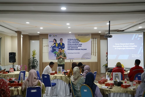 Kantor Pelayanan Pajak (KPP) Madya Karawang menyelenggarakan Sosialisasi Anti Korupsi dan Proses Pengembalian Pendahuluan Kelebihan Pembayaran Pajak di Aula KPP Madya Karawang Jalan Interchange Tol Karawang Barat, Karawang (Selasa, 25/6). Sejumlah 20 Wajib Pajak hadir di acara sosialisasi bertajuk "Peran Masyarakat Dalam Peningkatan Budaya Integritas di Lingkungan Kemenkeu".