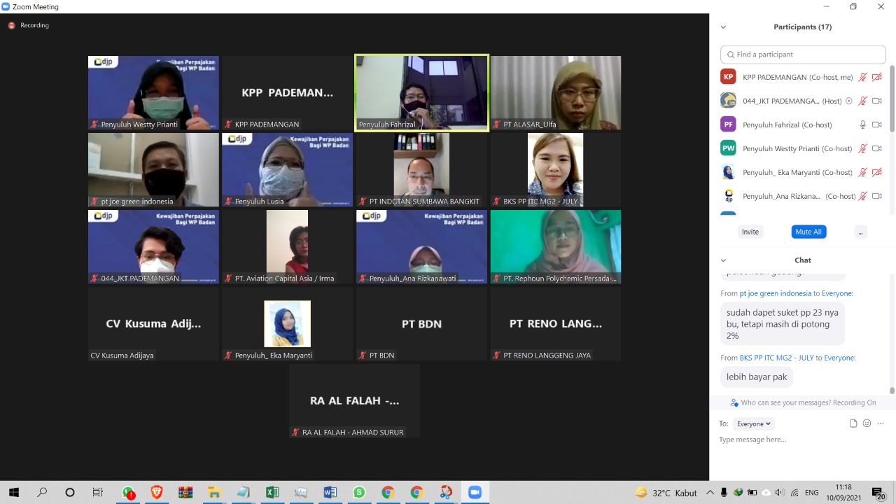 Kantor Pelayanan Pajak (KPP) Pratama Jakarta Pademangan mengadakan kelas pajak terkait kewajiban Wajib Pajak Badan (Jumat, 10/9). Kegiatan ini dilangsungkan secara daring melalui kanal Zoom Meeting dari ruang kelas pajak KPP Pratama Jakarta Pademangan, DKI Jakarta.