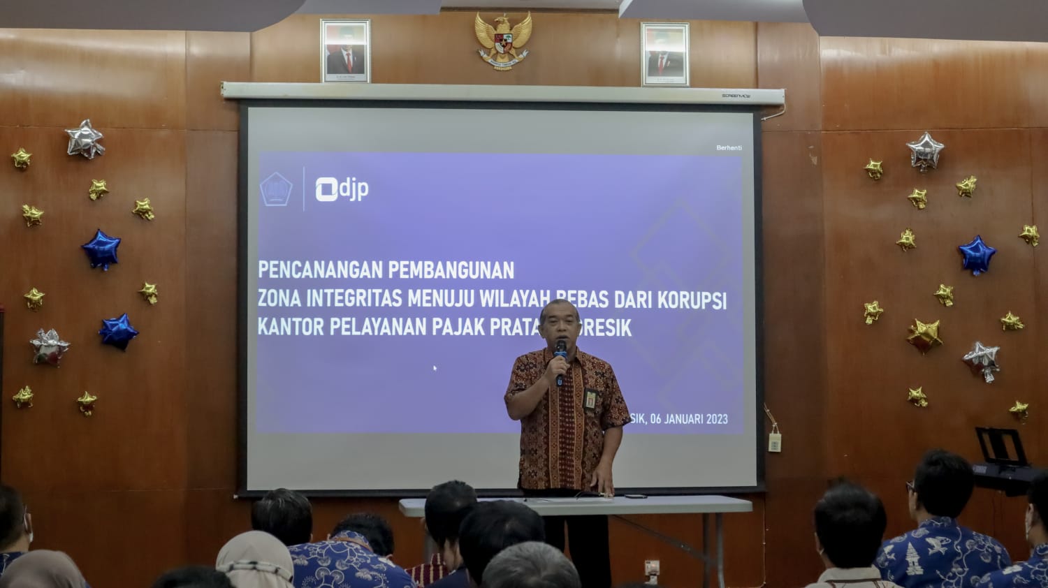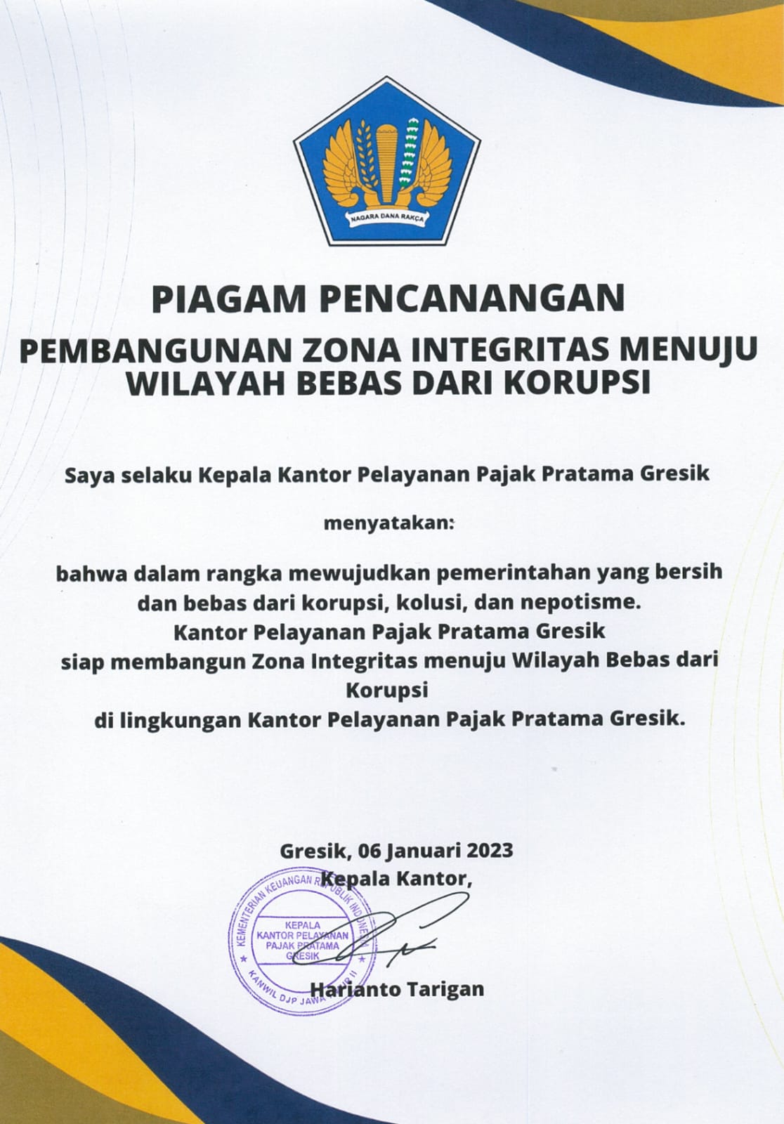 KPP Pratama Gresik melakukan Pencanangan Pembangunan Zona Integritas menuju Wilayah Bebas dari Korupsi (ZI WBK) oleh Kepala KPP Pratama Gresik, Harianto Tarigan dan disaksikan oleh seluruh pegawai (Jumat, 6/1).