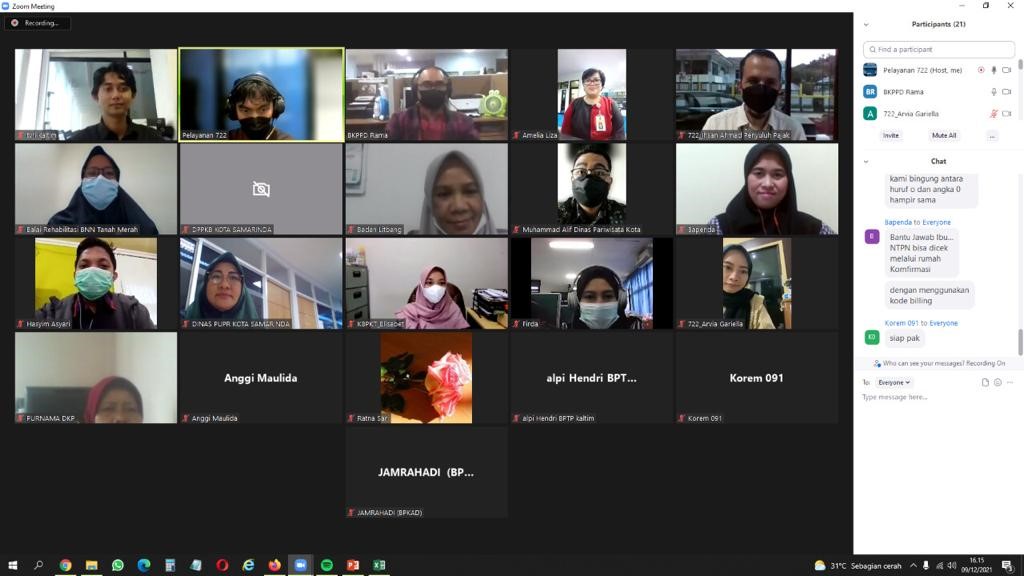 Kantor Pelayanan Pajak (KPP) Pratama Samarinda Ilir melangsungkan sosialisasi khusus bendahara dengan tema “Tata Cara Pelaporan Surat Pemberitahuan (SPT) Masa Pajak Penghasilan (PPh) 21 bagi Bendahara Pemerintah” secara daring melalui aplikasi Zoom Meetings di Kota Samarinda (Kamis, 9/12). Berlangsung acara sosialisasi selama 2 jam sejak pukul 14.00 hingga 16.00 WITA.