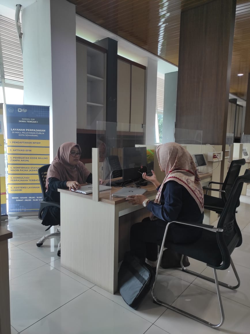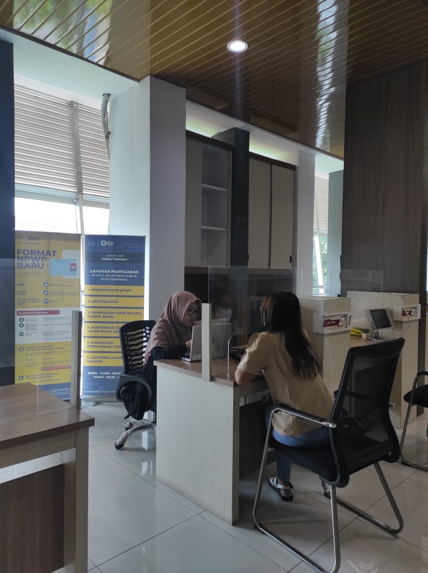 Eka Nofianti (Fungsional Asisten Penyuluh Pajak) dan Dyas Tri Pamungkas (Pelaksana Seksi Pelayanan) hadir sebagai petugas pelayanan di MPP Kota Semarang. Eka berkata, pemberian layanan ini merupakan bentuk penyelenggaraan pelayanan perpajakan kepada wajib pajak di Kota Semarang.
