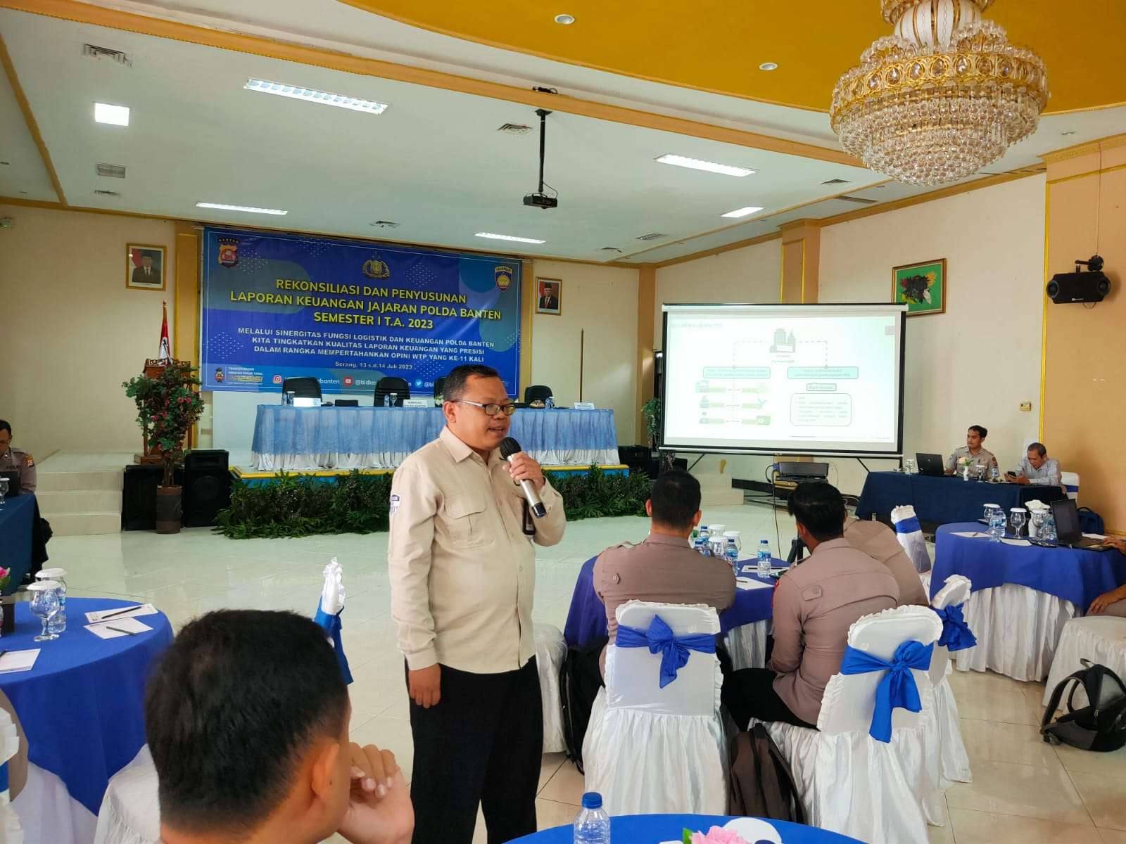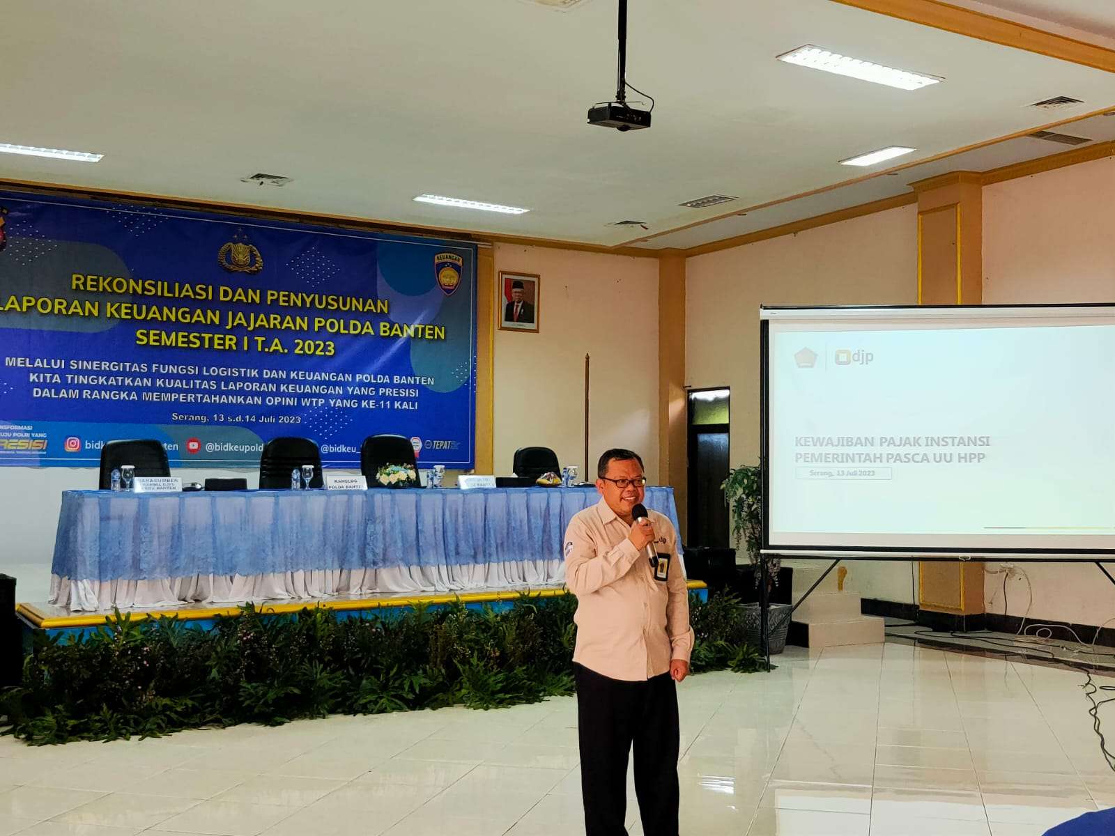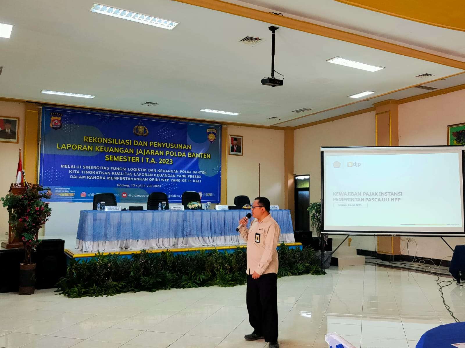Fungsional Penyuluh Pajak Ahli Muda Kantor Pelayanan Pajak (KPP) Pratama Serang Barat Slamet Riyanto menghadiri undangan sebagai narasumber dalam acara Penyusunan dan Penyajian Laporan Keuangan Semester I Tahun Anggaran 2023 oleh Bidang Keuangan Polda Banten, bertempat di Aula Polda Banten, Jalan Syekh Moh. Nawawi Albantani No.76, Banjarsari, Kecamatan Cipocok Jaya, Kota Serang, Banten (Kamis, 13/7).