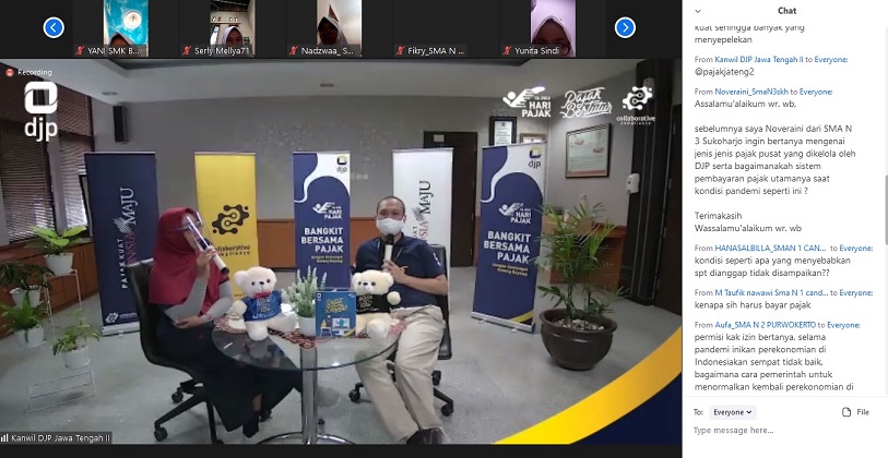 KPP Pratama Sukoharjo bersama Kanwil DJP Jawa Tengah II dan 2 KPP lainnya turut menyemarakkan Hari Pajak 14 Juli dengan menyelenggarakan kegiatan Pajak Bertutur (Patur) secara daring melalui aplikasi Zoom di KPP Pratama Sukoharjo (Rabu, 15/07). Kegiatan ini diikuti oleh siswa-siswi dari SMA 3 Sukoharjo, SMA 2 Purwokerto, SMA 1 Surakarta, SMA 1 Candiroto, dan SMK Bhumi Pala Parakan.