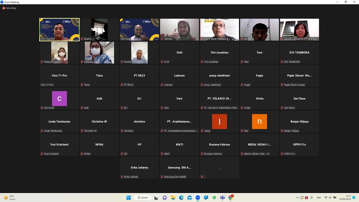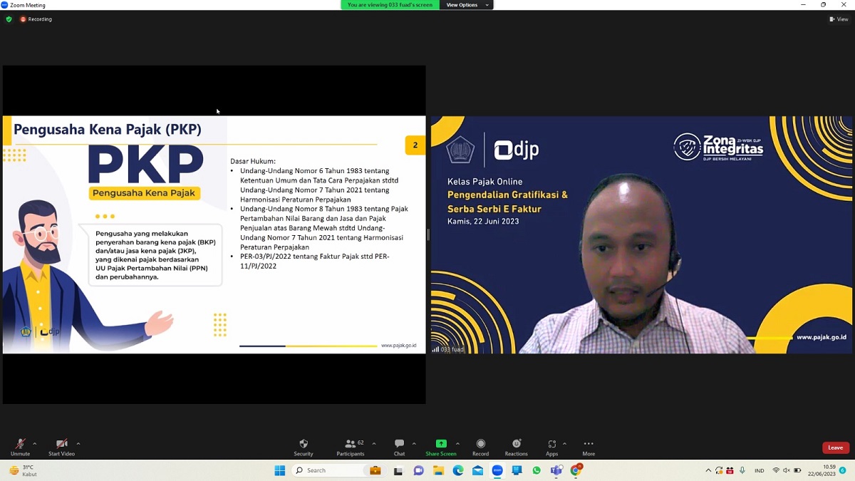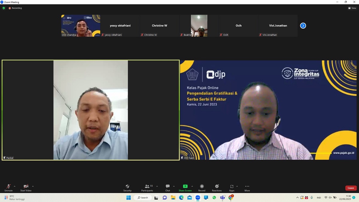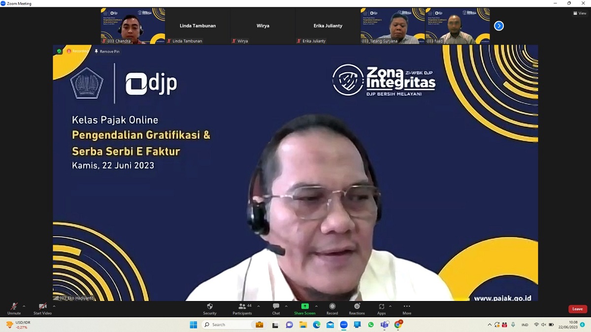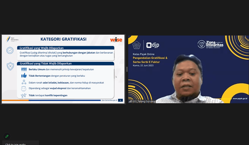 Kantor Pelayanan Pajak (KPP) Pratama Jakarta Tambora mengadakan kelas pajak dengan tema "Pengendalian Gratifikasi dan Serba-Serbi E-Faktur" melalui aplikasi Zoom Meeting di KPP Pratama Jakarta Tambora, Tambora, Jakarta Barat (Kamis, 22/6).