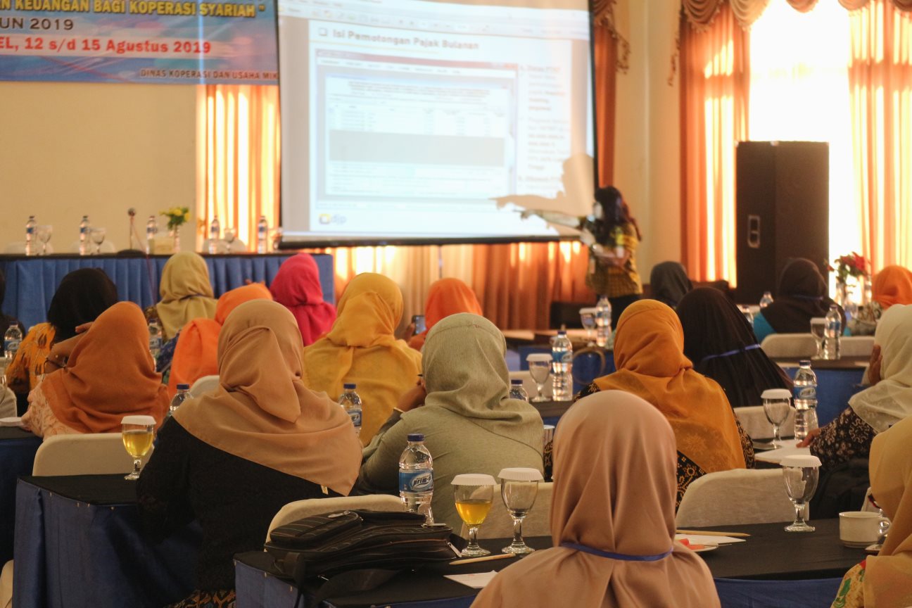 Hari kedua sosialisasi kepada Koperasi Wanita Pemasaran Syariah (KWPS) Kabupaten Lamongan membahas bagaimana Penghitungan dan Pelaporan SPT Masa Koperasi Syariah bertempat di Hotel Grand Mahkota, Jalan Sunan Drajat 24, Lamongan (Selasa, 13/8).