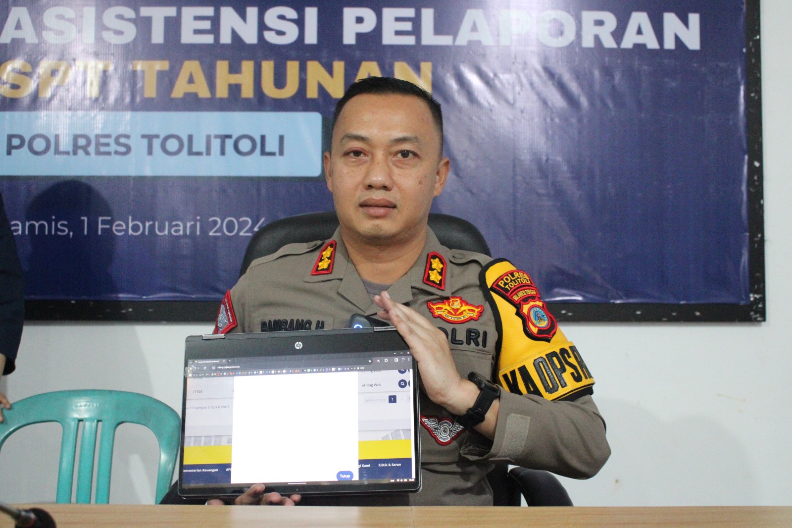 Pegawai Kantor Pelayanan Pajak (KPP) Pratama Tolitoli mengunjungi Kepolisian Resor (Polres) Tolitoli, Jalan Daud Lapau Nomor 1, Tolitoli, Sulawesi Tengah (Kamis, 1/2). Tujuan dari kunjungan kali ini untuk memberikan asistensi pelaporan Surat Pemberitahuan (SPT) Tahunan. Kedatangan petugas pajak disambut dengan hangat oleh Kepala Polres (Kapolres) Tolitoli AKBP Bambang Herkamto, S.H. Kegiatan asistensi ini dilaksanakan di Aula Polres Tolitoli.