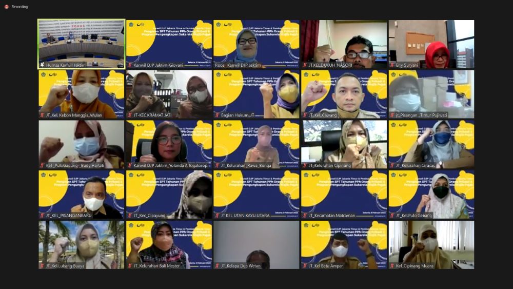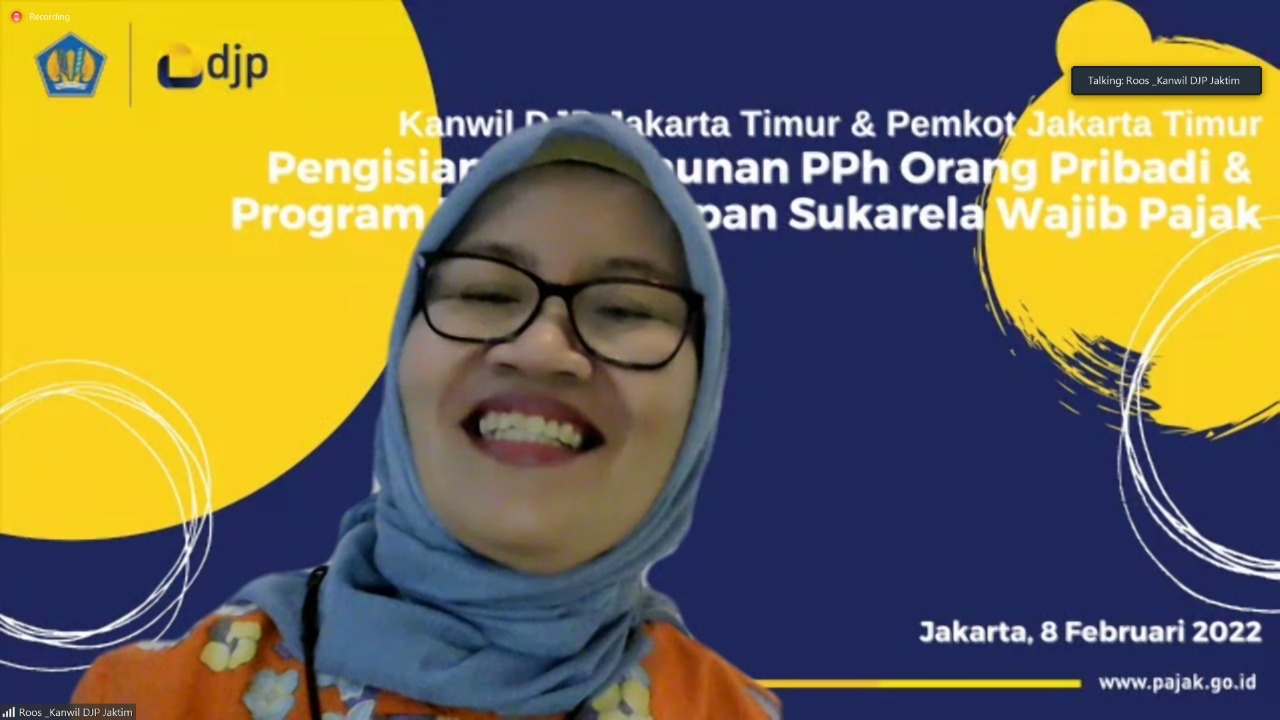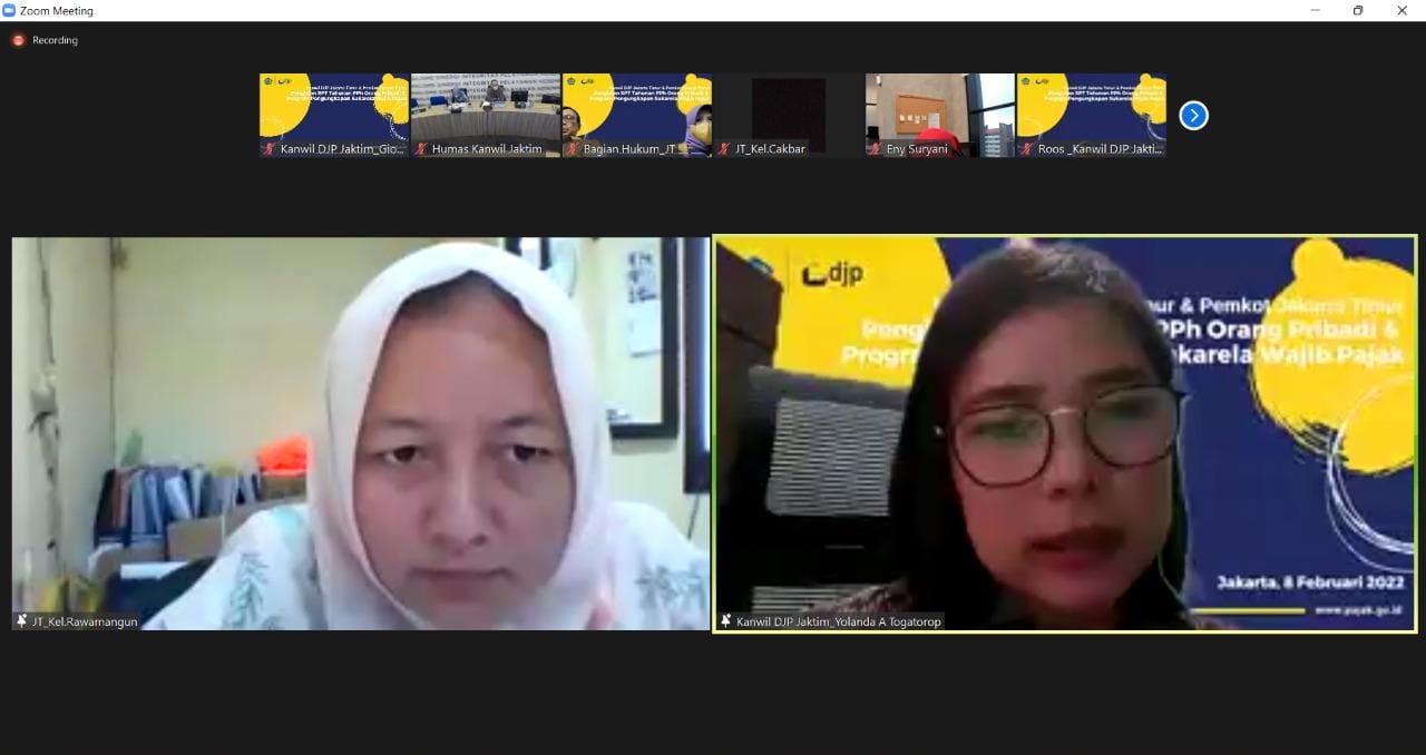 Kantor Wilayah DJP Jakarta Timur menyelenggarakan Sosialisasi Tata Cara Pelaporan SPT Tahunan PPh Orang Pribadi dan Program Pengungkapan Sukarela bagi Pegawai Pemerintah Kota Administrasi Jakarta Timur secara daring melalui aplikasi Zoom Meeting di Jakarta (Selasa, 8/2).