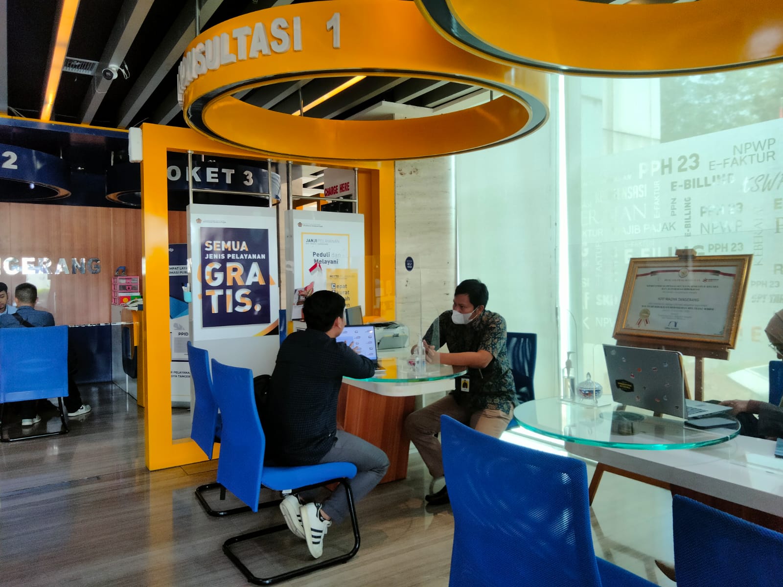 Penyuluh Pajak Kantor Pelayanan Pajak (KPP) Madya Tangerang memberikan asistensi kepada wajib pajak terkait penggunaan aplikasi e-Faktur. Kegiatan asistensi ini dilakukan langsung di ruang helpdesk Tempat Pelayanan Terpadu (TPT) KPP Madya Tangerang, Gedung Menara Top Food, Alam Sutera, Jalan Jalur Sutera Barat No.3, RT.003/RW.006, Panunggangan Timur, Pinang, Kota Tangerang, Banten (Selasa, 3/10).