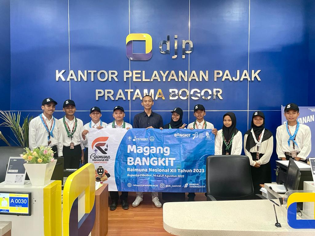 Kantor Pelayanan Pajak (KPP) Pratama Bogor menerima kunjungan Peserta Raimuna Nasional (Rainas) XII yang sedang menjalankan program Magang Bangkit, Kota Bogor (Selasa, 15/8). Delapan anggota pramuka Peserta Raimuna Nasional XII belajar dan mengenal Tempat Pelayanan Terpadu (TPT).
