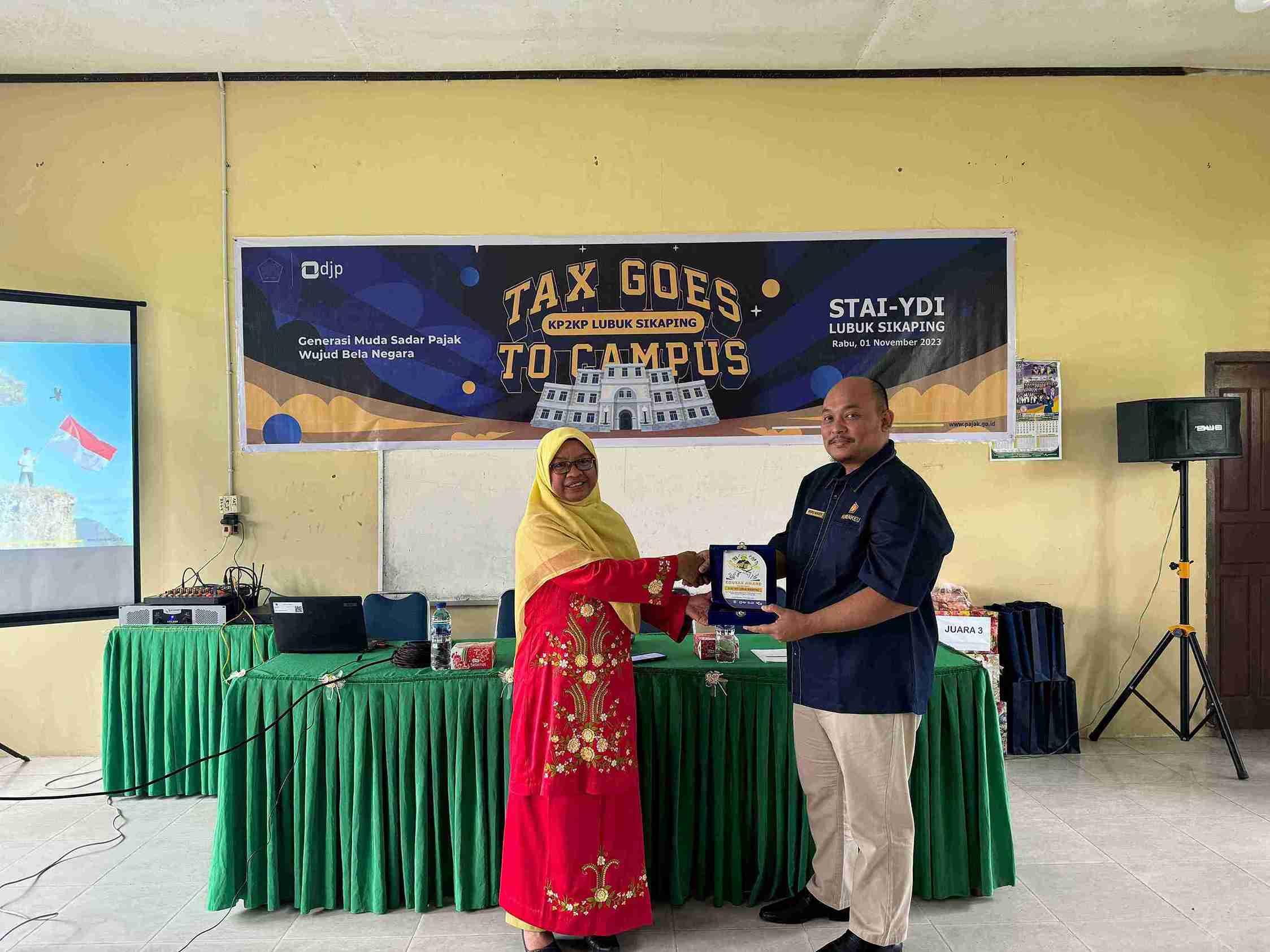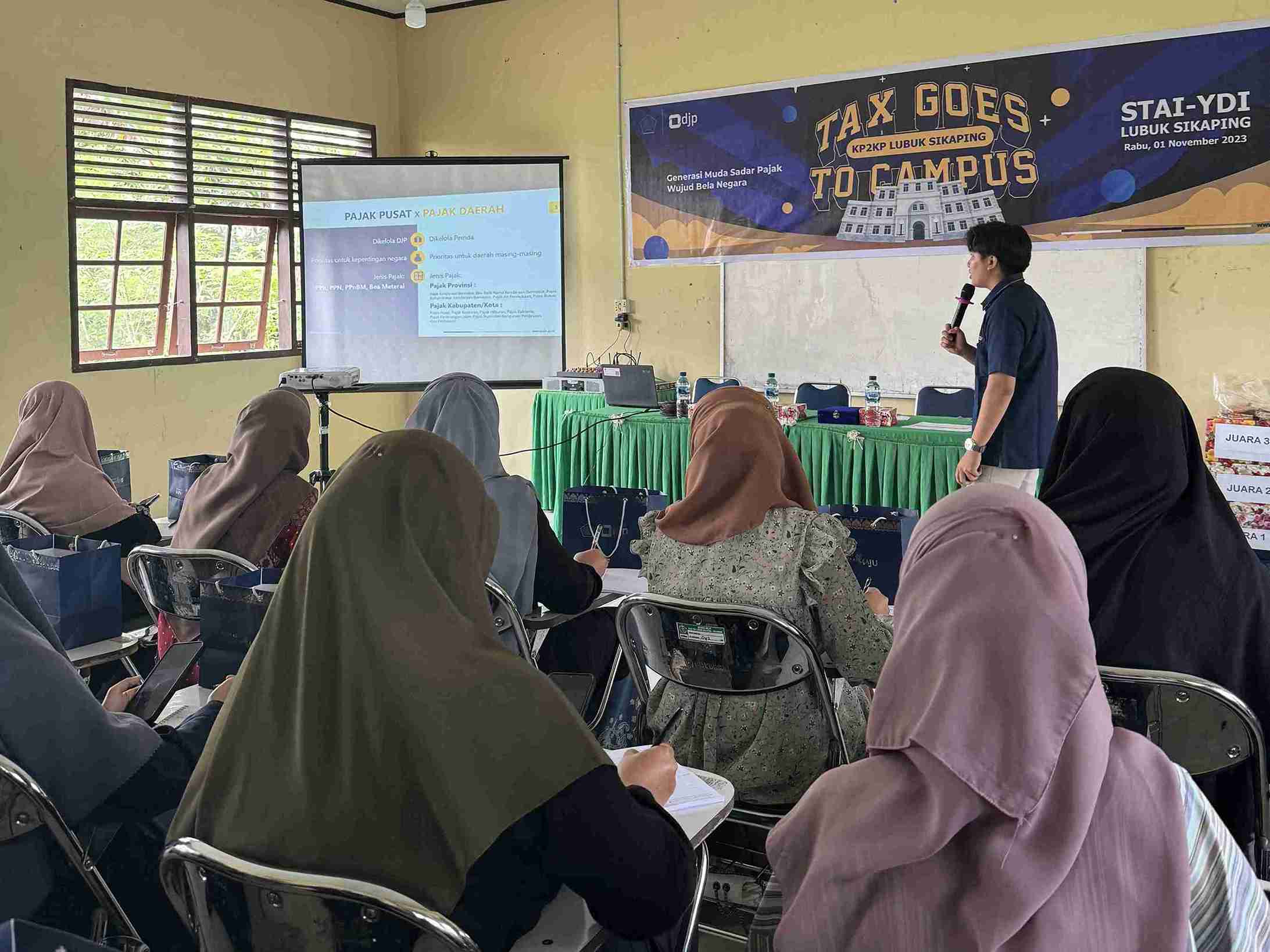 Kantor Pelayanan, Penyuluhan, dan Konsultasi (KP2KP) Lubuk Sikaping mengadakan Tax Goes To Campus (TGTC) 2023 di Sekolah Tinggi Agama Islam Yayasan Dakwah Islamiyah (STAI YDI) Lubuk Sikaping, Pasaman, Sumatera Barat (Rabu, 1/11). Acara diselenggarakan pada pukul 09.00 s.d 12.00 WIB dan dihadiri oleh 53 mahasiswa STAI YDI Lubuk Sikaping.