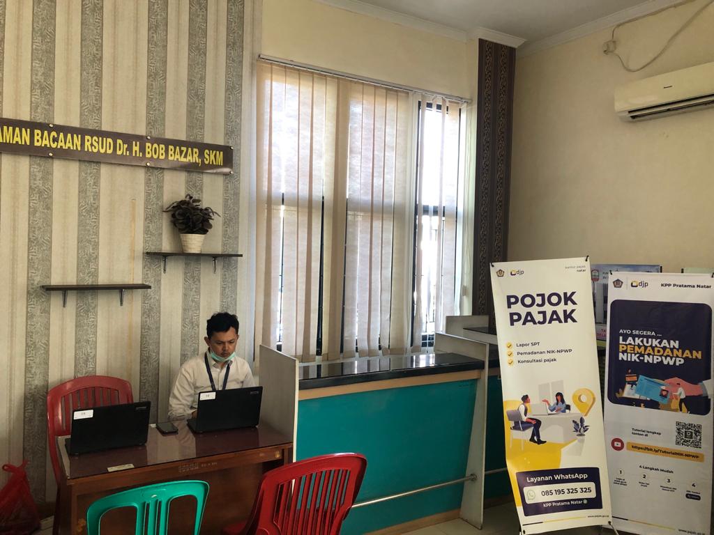Kantor Pelayanan Pajak (KPP) Pratama Natar bekerja sama dengan Kantor Pelayanan, Penyuluhan, dan Konsultasi Perpajakan (KP2KP) Kalianda membuka pojok pajak di RSUD Bob Bazar, Kabupaten Lampung Selatan (Senin, 27/3). Pojok pajak diselenggarakan dalam kurun waktu dua hari sejak tanggal 27 Maret 2023 sampai dengan 28 Maret 2023 yang berlokasi di Jl. Batin Tjindar Bumi No. 14B, Kedaton, Kalianda, Kabupaten Lampung Selatan.