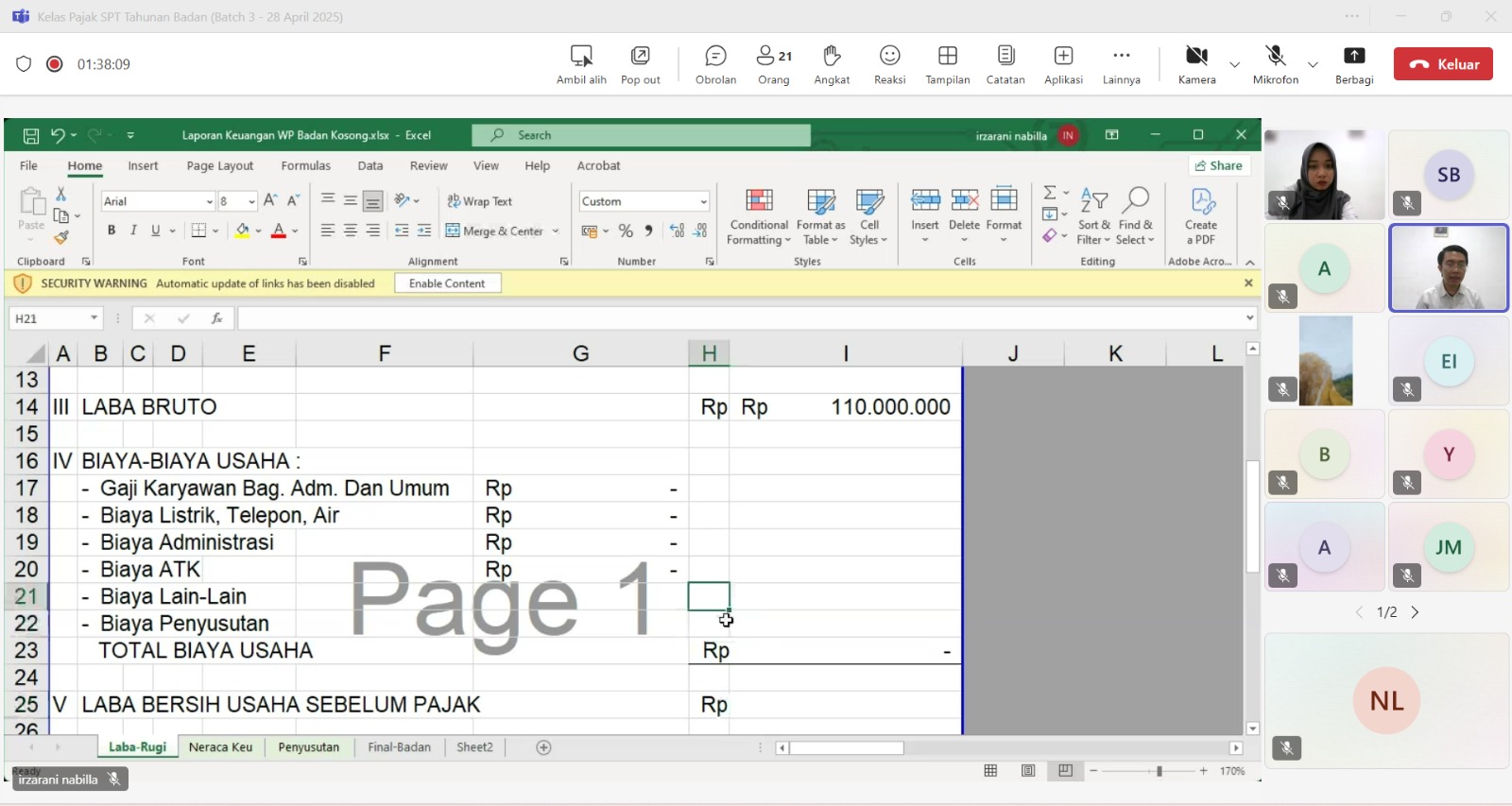 Selain penyampaian materi, Ata juga mengajarkan kepada kawan pajak dengan cara praktik langsung pengisian laporan keuangan seperti laporan laba rugi, neraca, dan penyusutan.