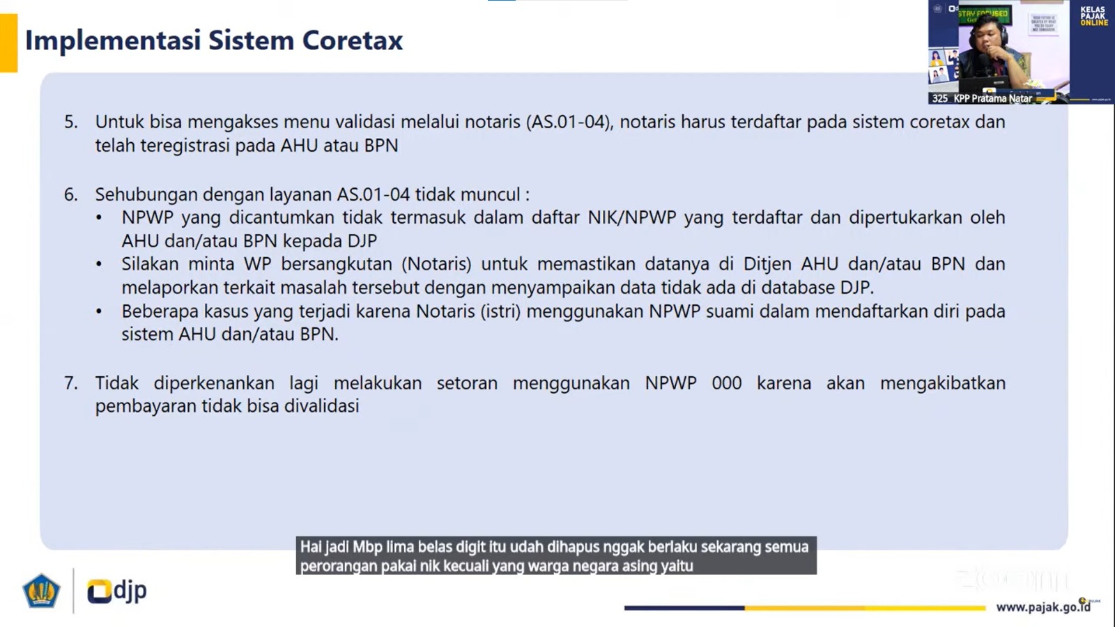 Selain itu, peserta juga dibimbing mengenai prosedur pengajuan validasi dari akun Notaris/PPAT sesuai dengan dokumen yang telah dilampirkan. "Dengan adanya sistem Coretax (DJP—red), proses validasi ini menjadi lebih cepat, transparan, dan terintegrasi dengan instansi terkait, seperti Badan Pertanahan Nasional (BPN)," tutup Candra.
