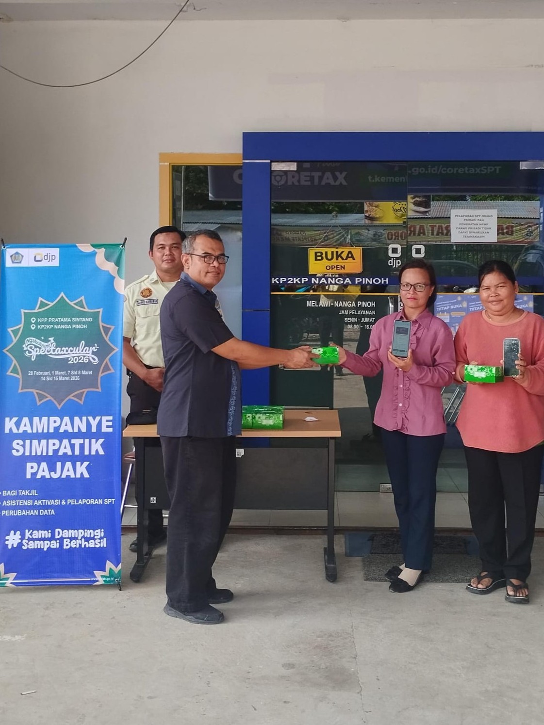 Dalam dokumentasi kegiatan, terlihat Munawar Kholil didampingi petugas keamanan memberikan bingkisan takjil secara langsung kepada wajib pajak yang telah menyelesaikan urusan perpajakannya. Mereka tampak menunjukkan bukti pelaporan melalui ponsel masing-masing, menandakan proses layanan perpajakan berjalan dengan lancar.