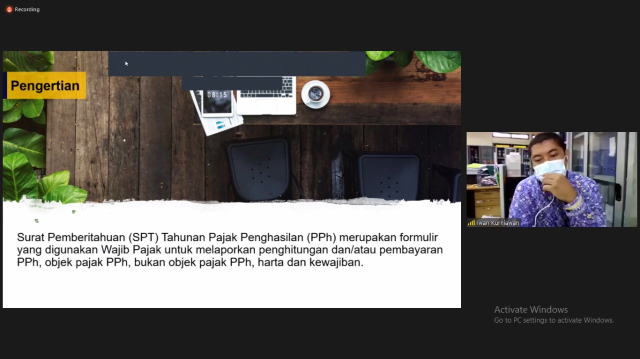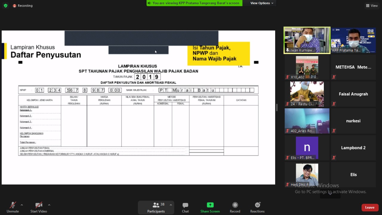 Wajib Pajak Badan mengikuti kelas pajak yang diadakan oleh KPP Pratama Tangerang Barat melalui Zoom Cloud Meeting dengan tema tata cara pelaporan SPT Tahunan untuk badan serta PMK-9/PMK.03/2021 tentang insentif pajak untuk wajib pajak terdampak pandemi Covid-19 (Selasa, 2/3).