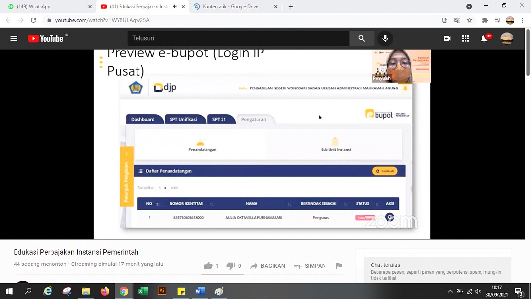 Kantor Pelayanan Pajak (KPP) Pratama Sidoarjo Barat menyelenggarakan edukasi perpajakan dengan tema “Implementasi Aplikasi e-Bupot Instansi Pemerintah” (Kamis, 30/9). Kegiatan dilaksanakan secara daring di Sidoarjo dan diikuti oleh lebih dari 100 bendaharawan pemerintah di lingkungan Kabupaten Sidoarjo.