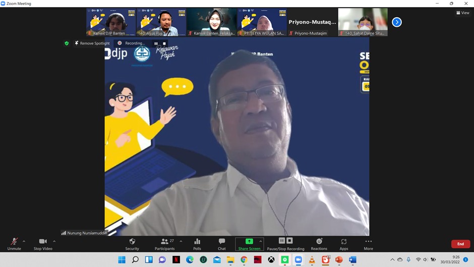 Kantor Wilayah (Kanwil) Direktorat Jenderal Pajak (DJP) Banten kembali mengadakan sosialisasi Undang-Undang Harmonisasi Peraturan Perpajakan (UU HPP) dan Program Pengungkapan Sukarela (PPS) kepada para anggota Gabungan Pelaksana Konstruksi (Gapensi) Banten secara daring melalui aplikasi Zoom Cloud Meeting di Kota Serang, Banten (Rabu, 30/3).