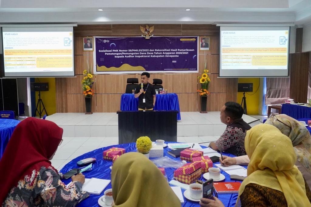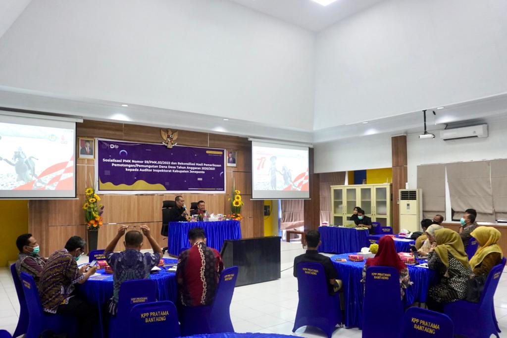 Kantor Pelayanan Pajak (KPP) Pratama Bantaeng mengadakan sosialiasi Peraturan Menteri Keuangan (PMK) nomor 59/PMK.03/2022 dan rekonsiliasi hasil pemeriksaan pemotongan/pemungutan dana desa tahun anggaran 2020/2021 kepada Auditor Inspektorat Kabupaten Jeneponto (Kamis, 1/9). Kegiatan ini dilaksanakan di Ruang Aula KPP Pratama Bantaeng.