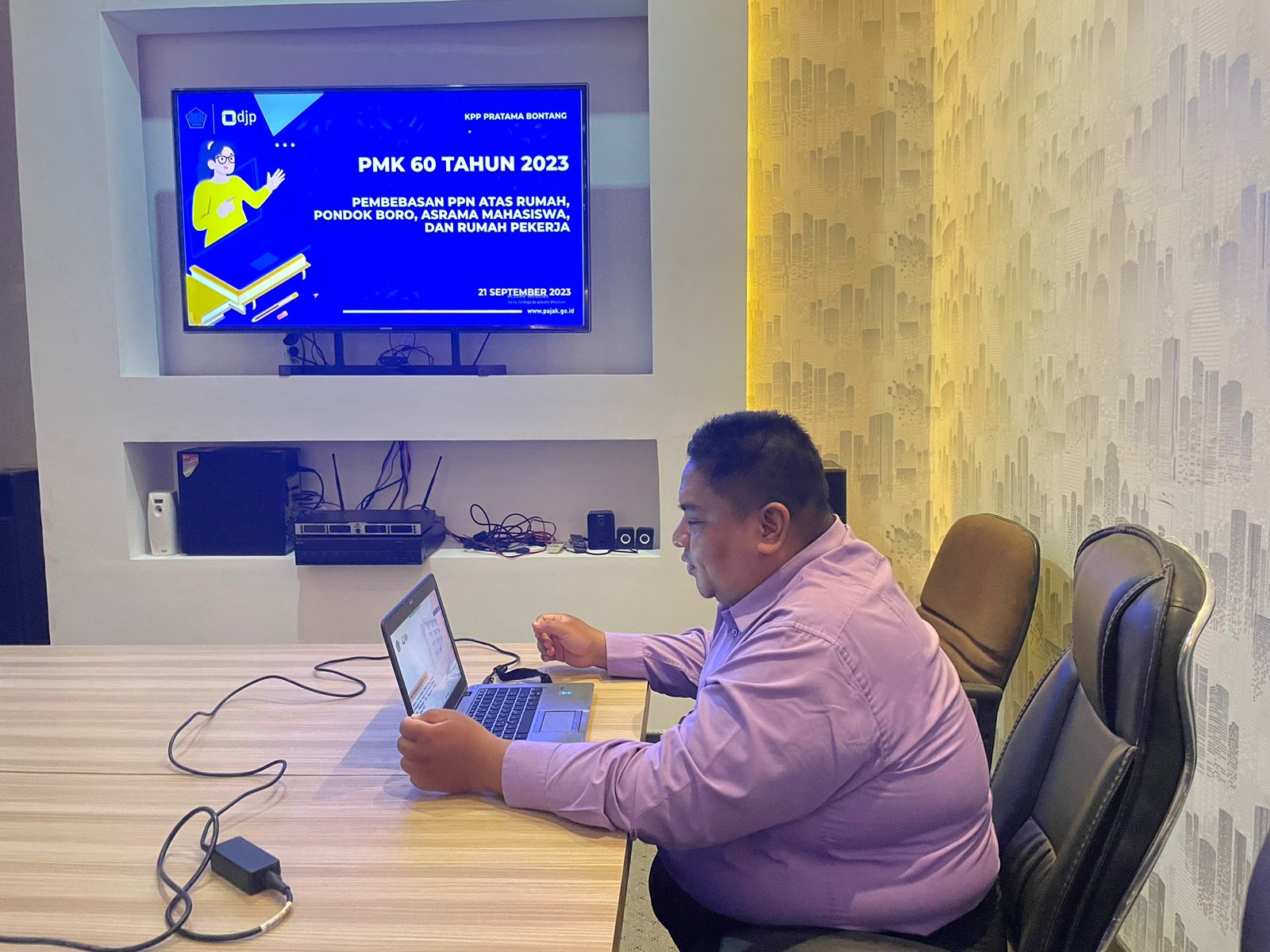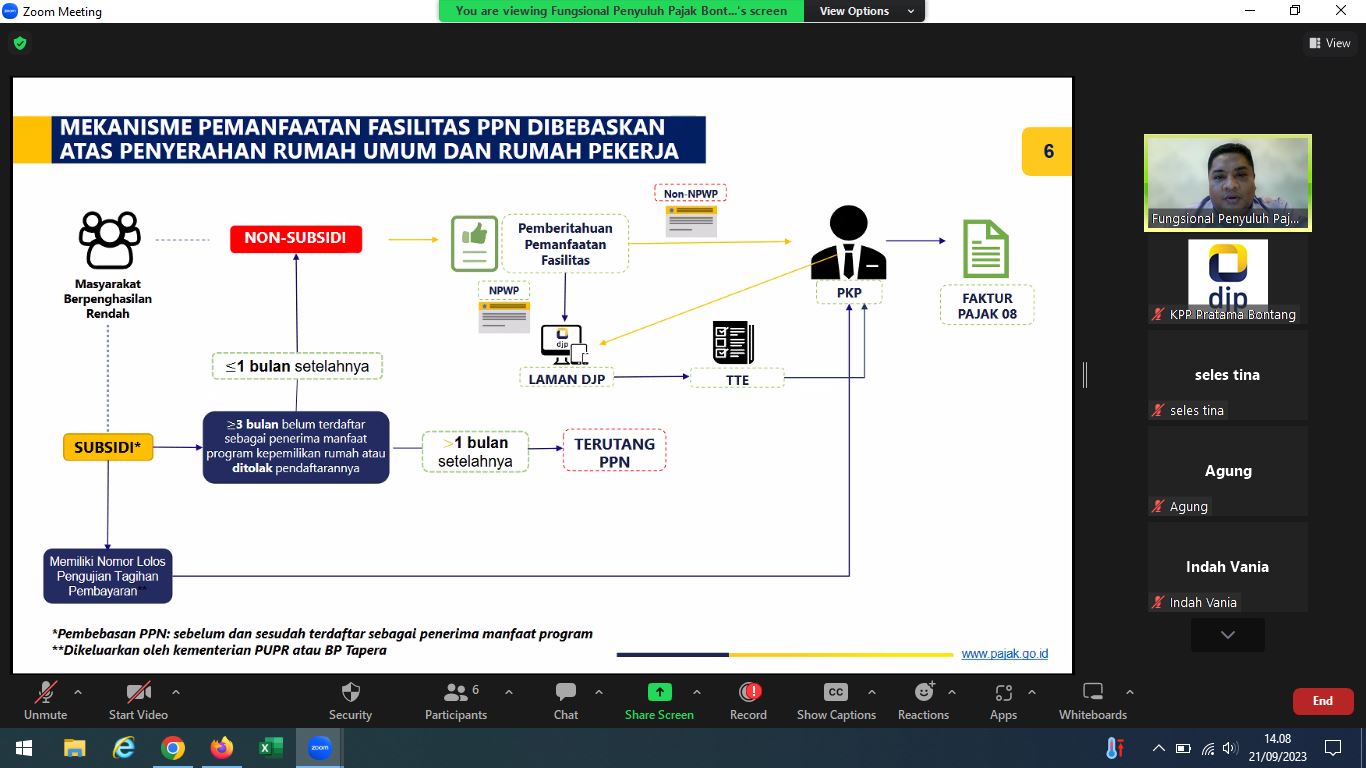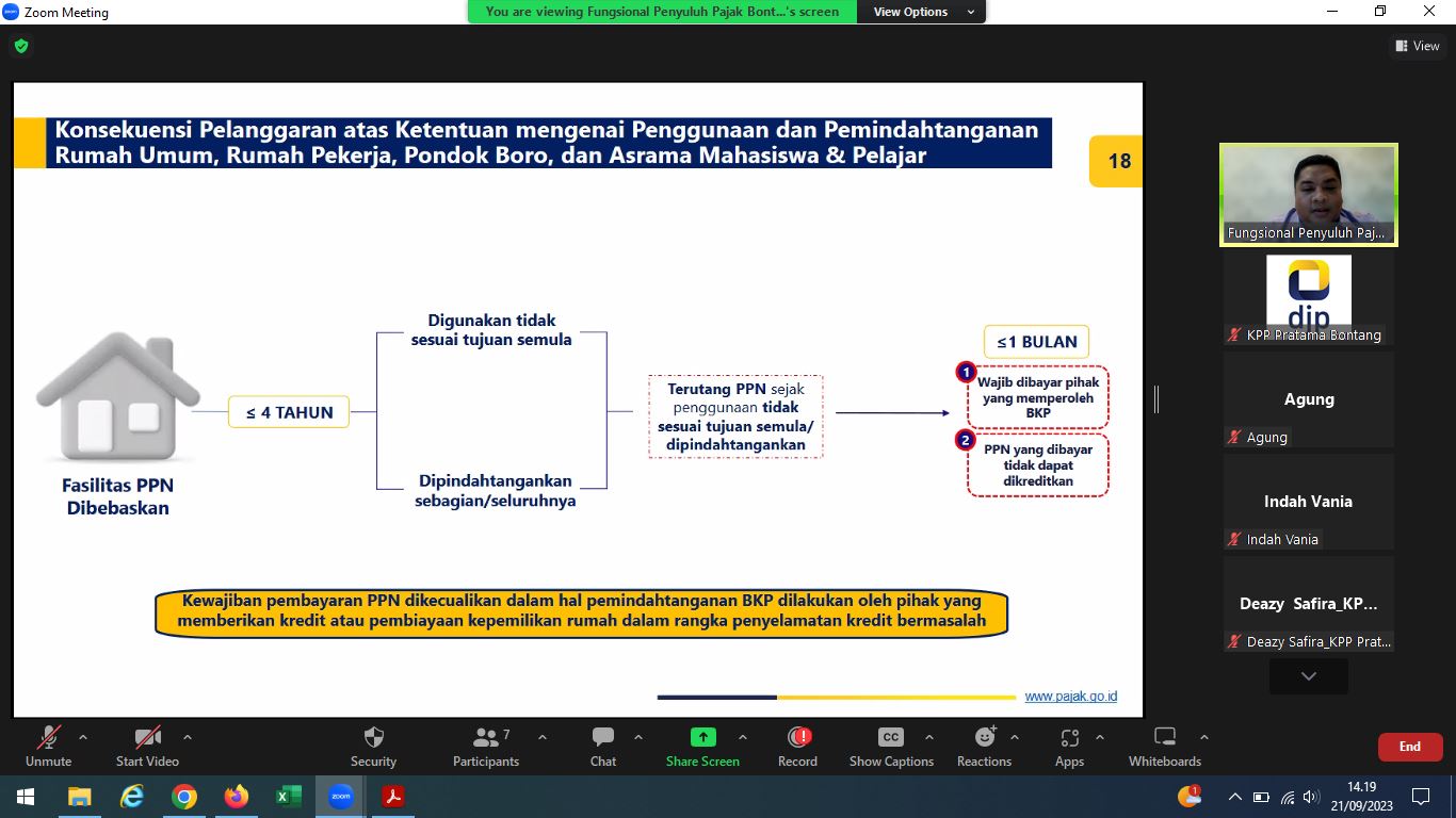 Kantor Pelayanan Pajak (KPP) Pratama Bontang mengadakan kelas pajak dengan materi pembahasan Peraturan Menteri Keuangan (PMK) Nomor 60 Tahun 2023 dengan menggunakan Zoom Meeting di Kota Bontang (Kamis, 21/9).