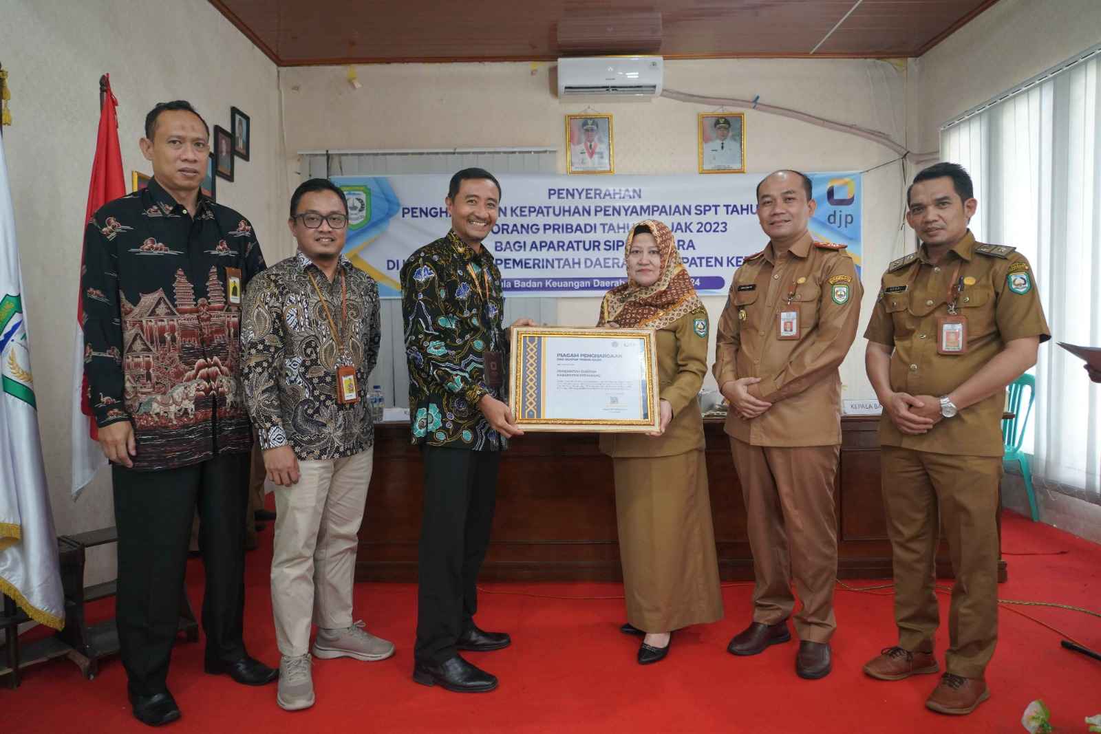 Pemda Kabupaten Kepahiang menerima penghargaan sebagai pemerintah daerah di wilayah kerja KPP Pratama Curup dengan capaian 100% dalam penyampaian SPT tahunan PPh Orang Pribadi Tahun Pajak 2022 bagi ASN wajib lapor SPT yang terdaftar di KPP Pratama Curup.