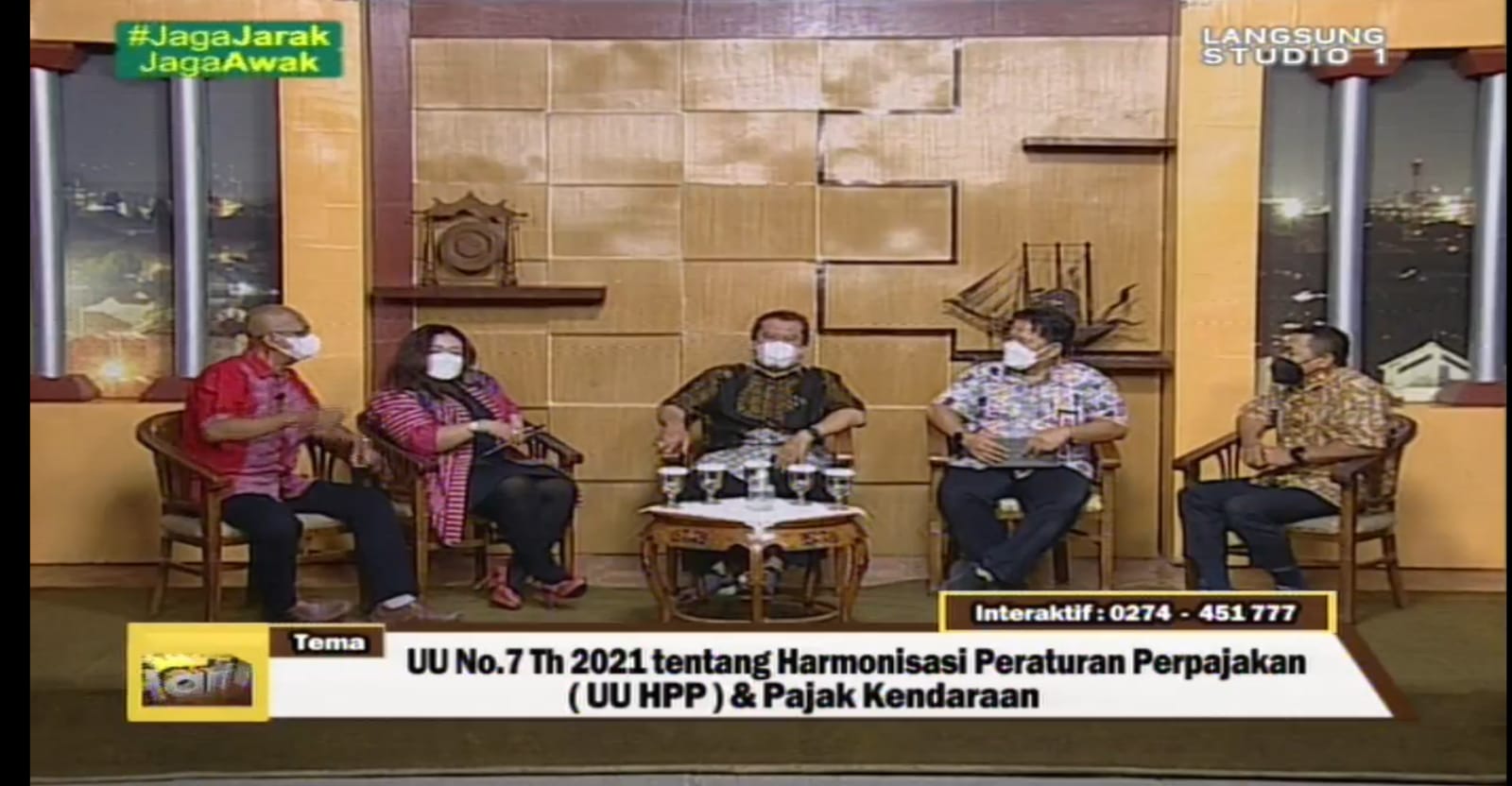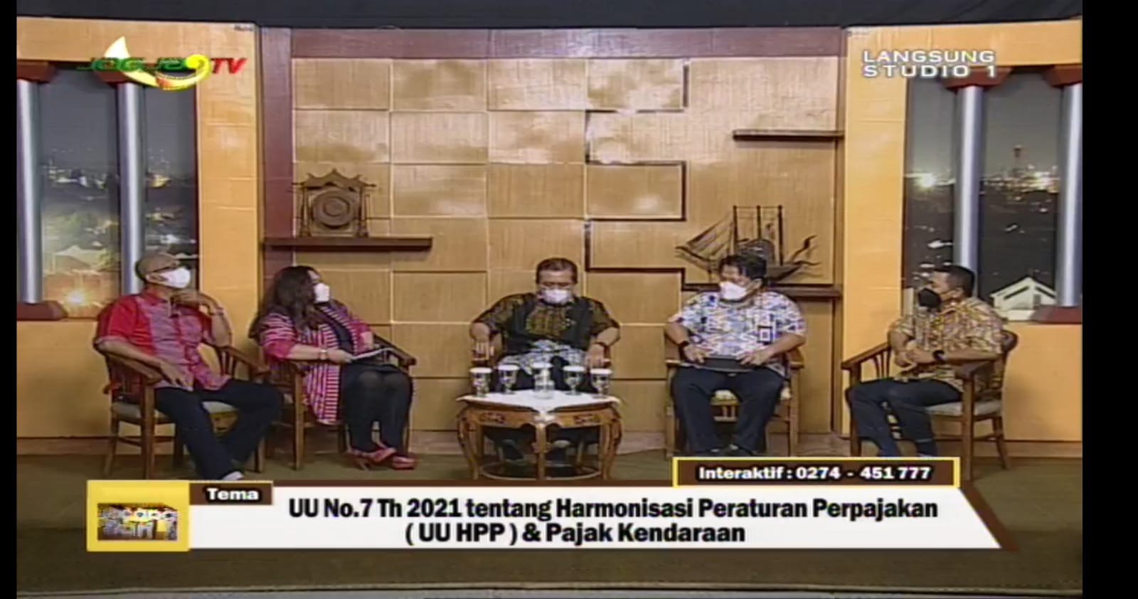 Kantor Wilayah Direktorat Jenderal Pajak Daerah Istimewa Yogyakarta (Kanwil DJP DIY) dan Badan Pengelolaan Keuangan dan Aset Daerah (BPKAD) Provinsi DIY melaksanakan dialog interaktif perpajakan dengan tema Undang-undang Harmonisasi Peraturan Perpajakan (UU HPP) dan Pajak Kendaraan Bermotor (PKB) di Studio Jogja TV di Sleman (Selasa, 08/02).