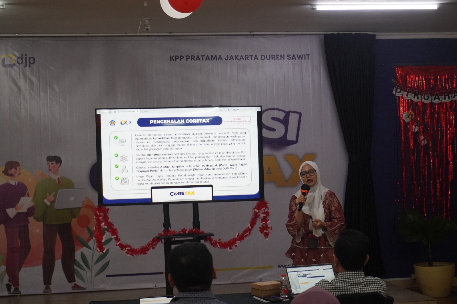Kepala KPP Pratama Jakarta Duren Sawit Amty Nurhayati dalam sambutannya menyampaikan informasi bawah DJP telah menyusun kegiatan edukasi Coretax untuk wajib pajak akan dibagi menjadi 3 tahap, yaitu, tahap 1 merupakan praktik langsung aplikasi yang berdampak pada proses bisnis wajib pajak dan ditujukan bagi wajib pajak terpilih. Tahap 2 akan dilakukan dalam bentuk kelas pajak dengan mekanisme pendaftaran, dan tahap 3 berupa simulasi interaktif untuk seluruh wajib pajak secara mandiri. Beliau juga menyampaikan bahwa informasi lebih lanjut terkait perkembangan Coretax akan disampaikan secara berkala, dan akan terus update melalui situs www.pajak.go.id