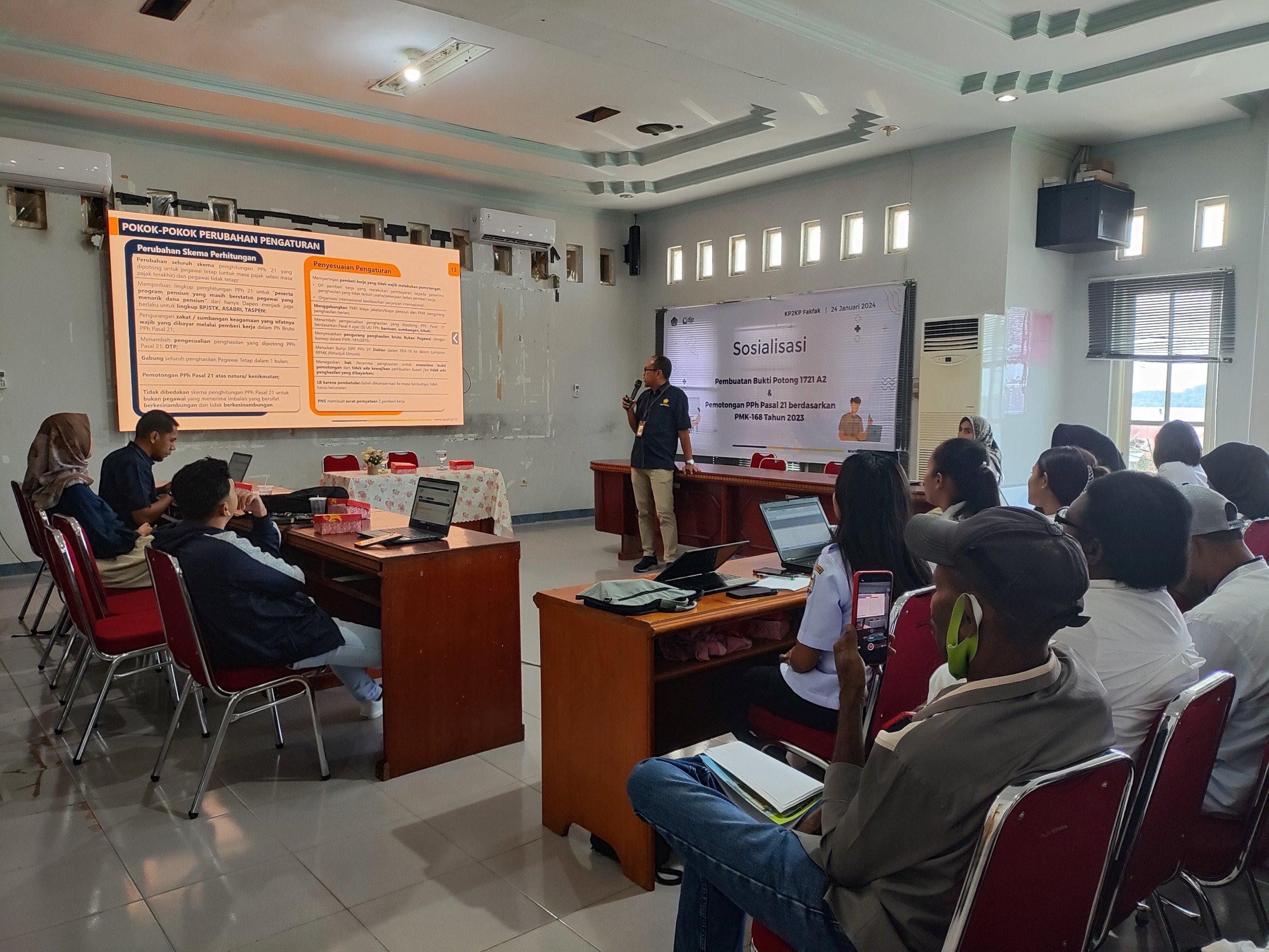 Kantor Pelayanan, Penyuluhan, dan Konsultasi Perpajakan (KP2KP) Fakfak berkolaborasi dengan Kantor Pelayanan Pajak (KPP) Pratama Sorong serta Badan Pengelolaan Keuangan dan Aset Daerah (BPKAD) Kabupaten Fakfak melaksanakan kegiatan sosialisasi Pembuatan Bukti Potong 1721-A2 dan Pemotongan PPh Pasal 21 berdasarkan Peraturan Menteri Keuangan (PMK) Nomor 168 Tahun 2023 Tahun 2023 tentang Petunjuk Pelaksanaan Pemotongan Pajak Atas Penghasilan Sehubungan Dengan Pekerjaan, Jasa, Atau Kegiatan Orang Pribadi kepada Bendahara Pemerintah di lingkungan Kabupaten Fakfak (Rabu, 24/1). Pada kesempatan tersebut, turut dihadiri oleh Abdul Kadir Ruslan Rumoning selaku Sekretaris BPKAD, mewakili kepala BPKAD yang kebetulan berhalangan hadir.