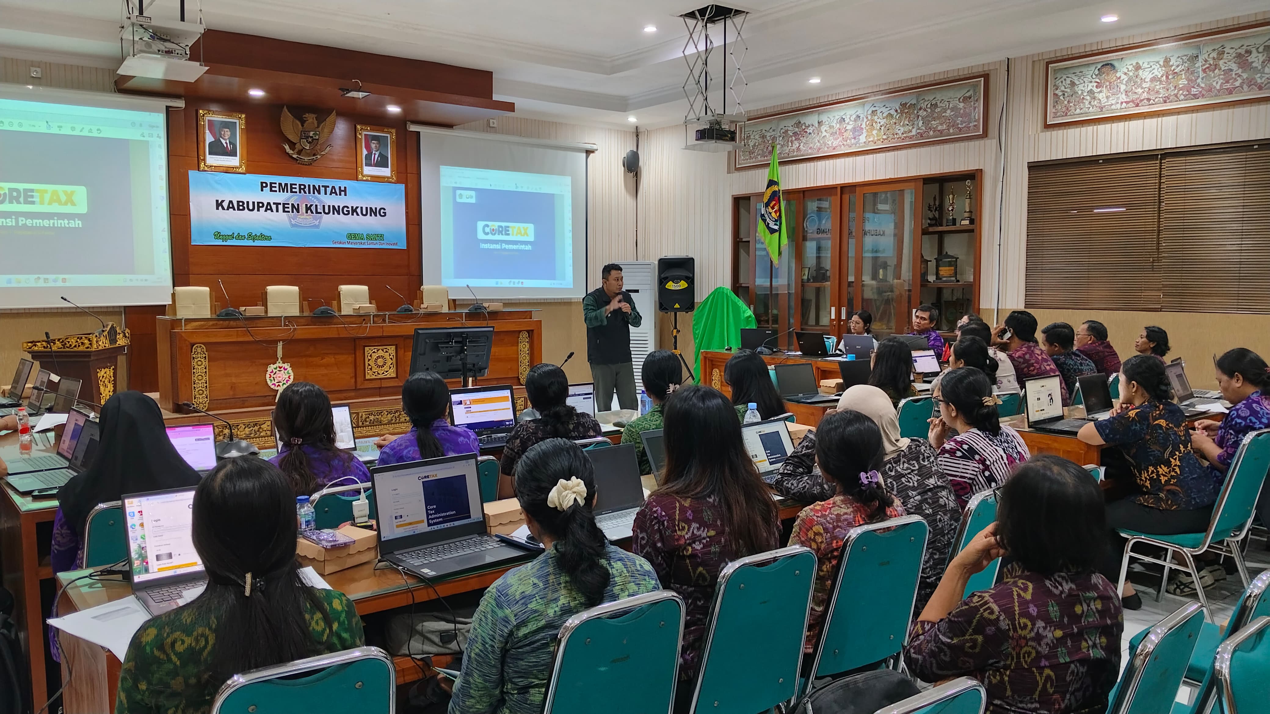 Kantor Pelauanan Pajak (KPP) Pratama Gianyar menyelenggarakan sosialisasi Coretax DJP di Ruang Rapat Praja Mandala, Kantor Bupati Klungkung, Jl. Untung Surapati No 2 Semarapura Tengah, Kabupaten Klungkung (Senin, 11/2). Adapun peserta sosialisasi Coretax DJP ini yaitu seluruh bendahara desa di Kecamatan Banjarangkan, Kecamatan Dawan, dan Kecamatan Klungkung.