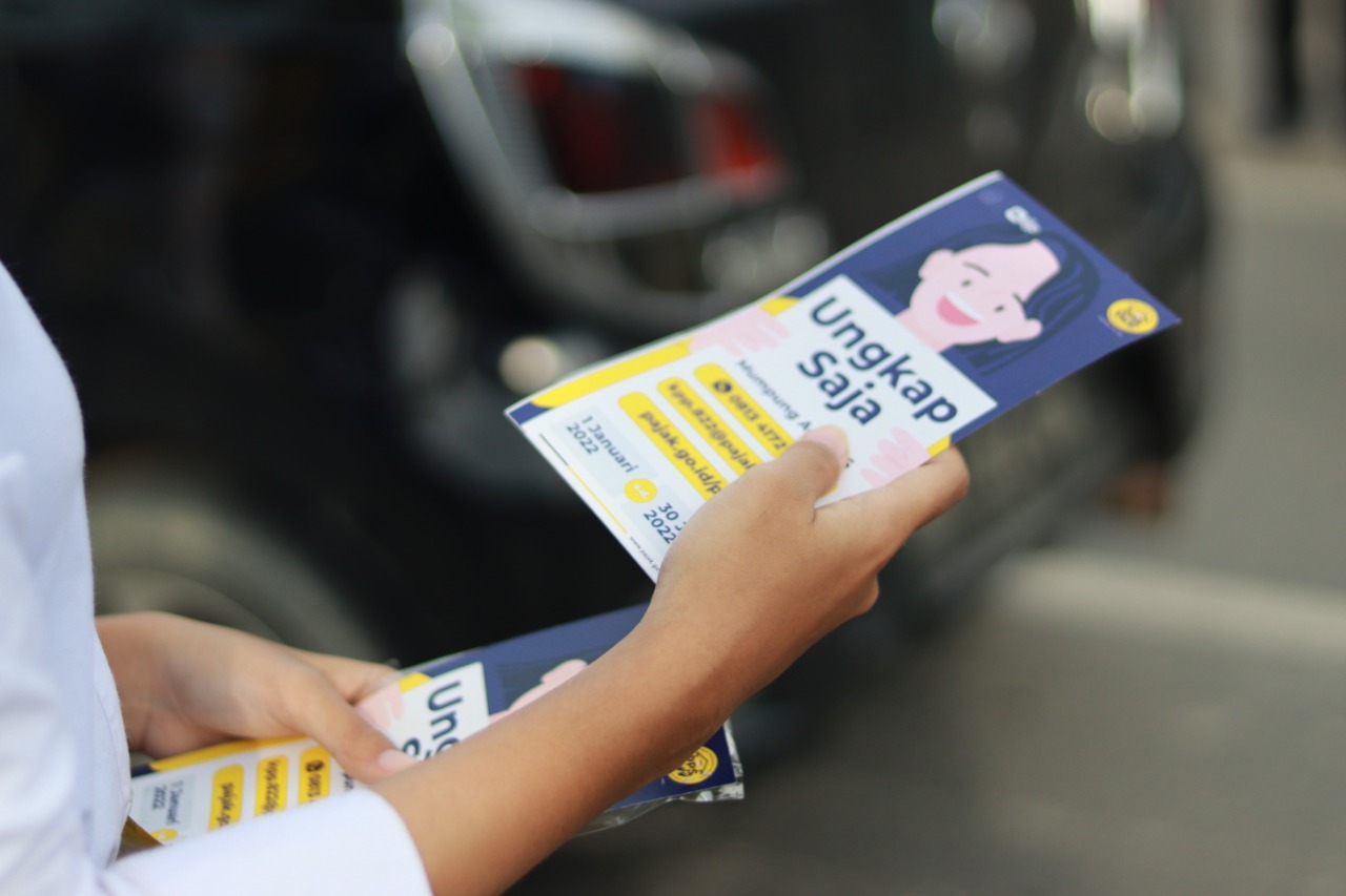 "Jangan lupa lapor SPT Tahunan, ya?!" teriak salah satu pegawai sambil melambai-lambaikan leaflet.