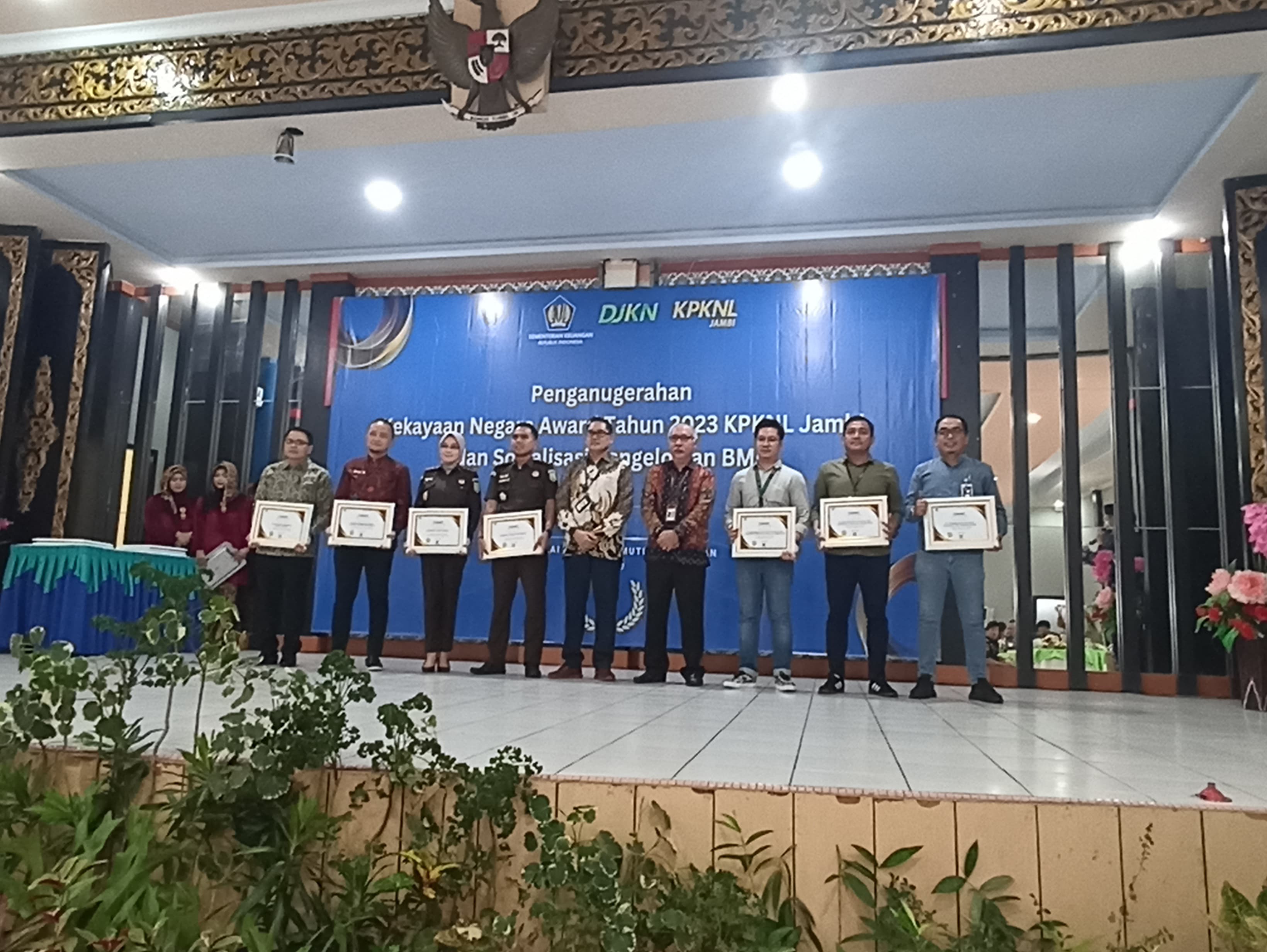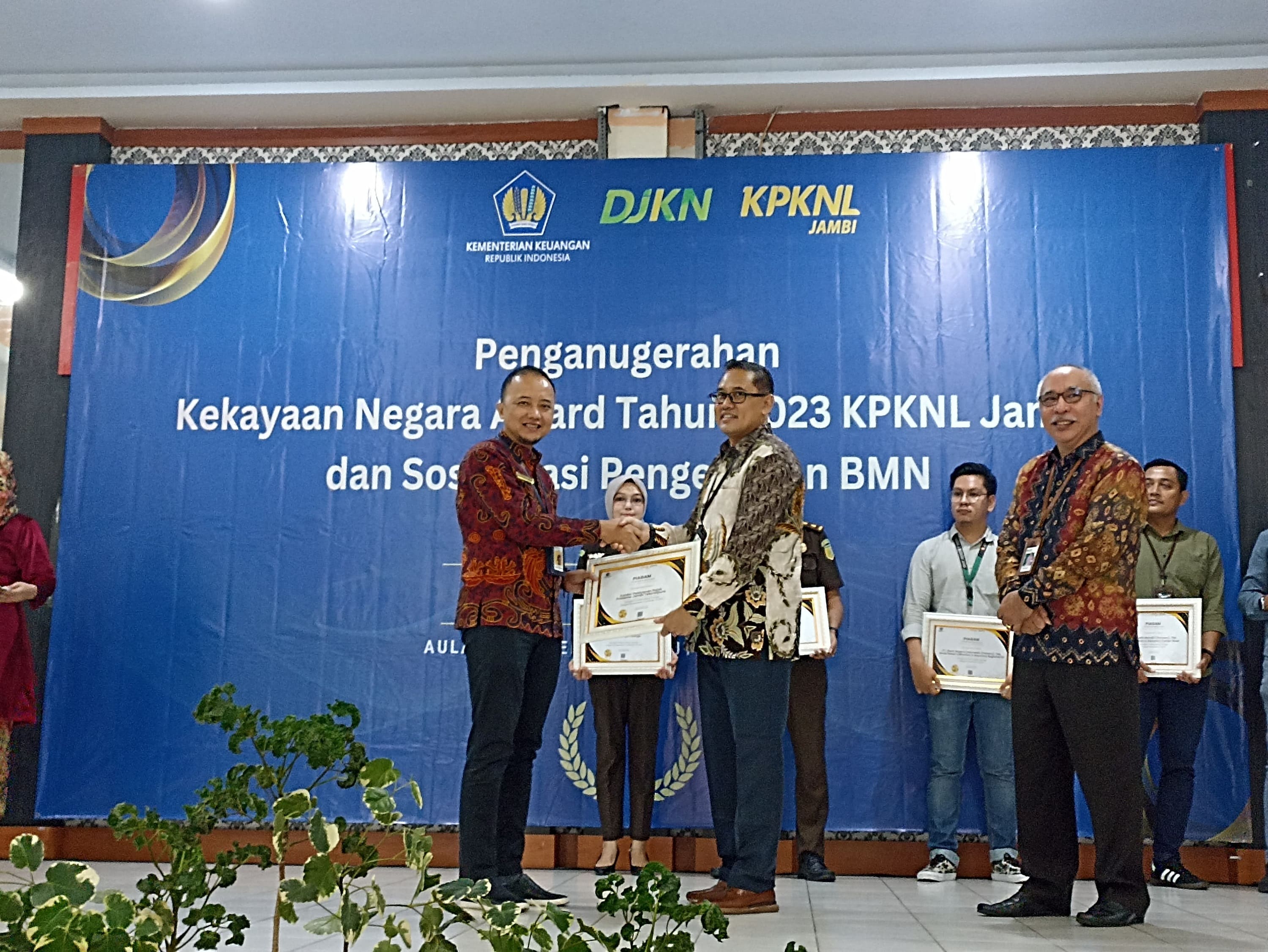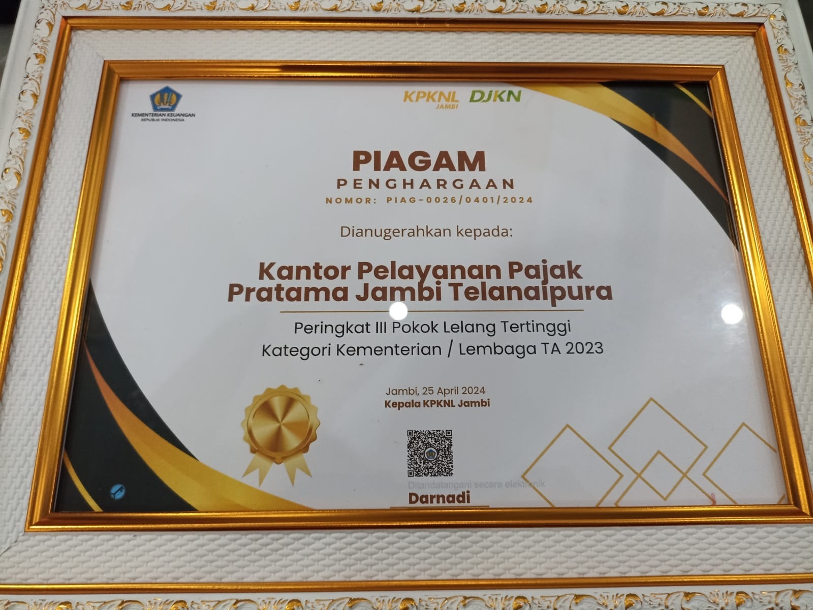 Kantor Pelayanan Pajak (KPP) Pratama Jambi Telanaipura menerima apresiasi dan penghargaan peringkat III kategori Pokok Lelang Tertinggi dalam acara Penganugerahan Kekayaan Negara Award Tahun 2023 yang diselenggarakan oleh Kantor Pelayanan Kekayaan Negara dan Lelang (KPKNL) Jambi (Kamis, 25/04). Acara tersebut berlangsung di Ruang Aula, Balai Penjaminan Mutu Pendidikan (BPMP), Jalan H.M. Yusuf Singadekane No. 31, Telanaipura, Kota Jambi.