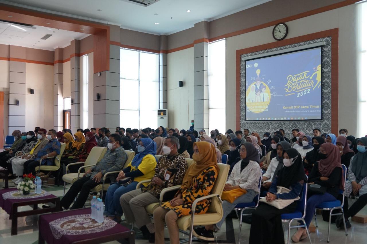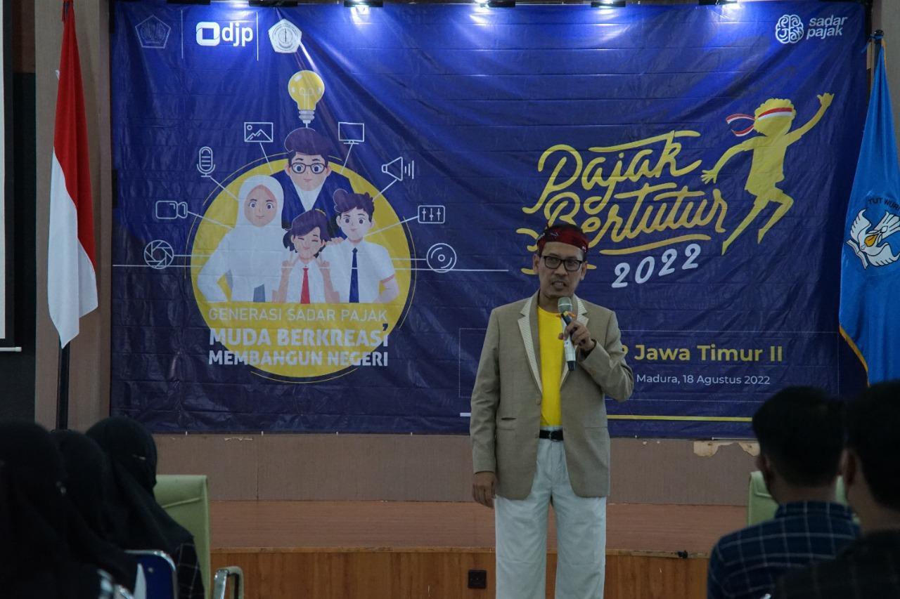 Kantor Wilayah Direktorat Jenderal Pajak (Kanwil DJP) Jawa Timur II menyelenggarakan kegiatan Pajak Bertutur 2022 dengan mengambil tema “Generasi Sadar Pajak, Muda Berkreasi Membangun Negeri”. Kegiatan Pajak Bertutur ini diikuti 120 peserta secara luring di Universitas Trunojoyo Madura, Jl. Raya Telang, Kab. Bangkalan (Kamis, 18/8).