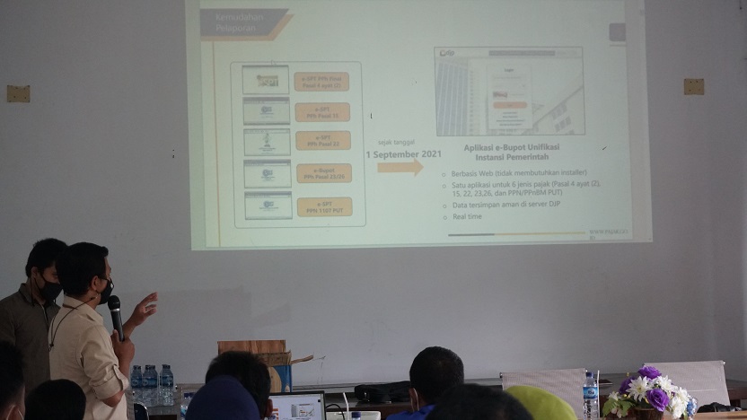 Materi disampaikan oleh Fungsional Penyuluh KPP Pratama Ketapang kemudian dilanjutkan dengan simulasi pembuatan Bukti Potong 1721 A2. Selain itu, para Bendahara OPD diberikan kesempatan untuk melakukan tanya jawab di akhir simulasi.