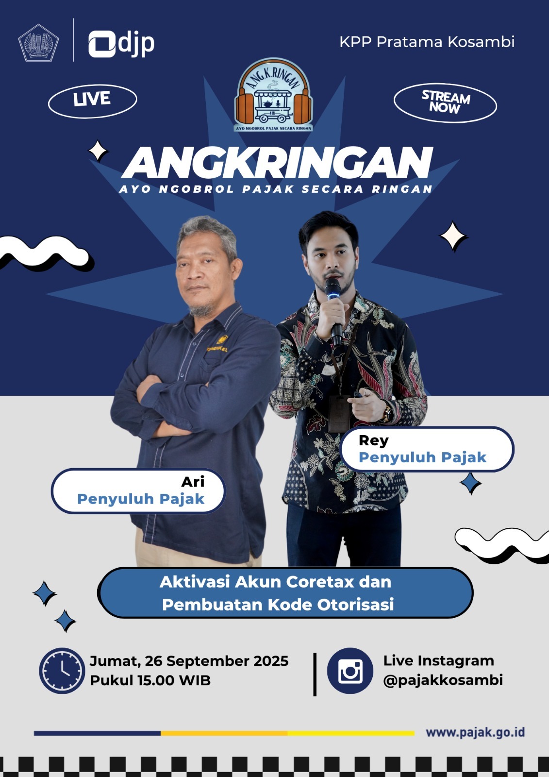 Kantor Pelayanan Pajak (KPP) Pratama Kosambi menyelenggarakan kegiatan Live Instagram bertema “Aktivasi Akun Wajib Pajak Coretax dan Pembuatan Kode Otorisasi” pada pukul 15.00 WIB (Jumat, 26/9). Acara ini menghadirkan dua narasumber, yaitu Fungsional Penyuluh Pajak, Ari Wiratmoko dan Muhammad Rayhan Safhara yang membahas mengenai pentingnya aktivasi akun Coretax serta cara pembuatan kode otorisasi bagi para wajib pajak.