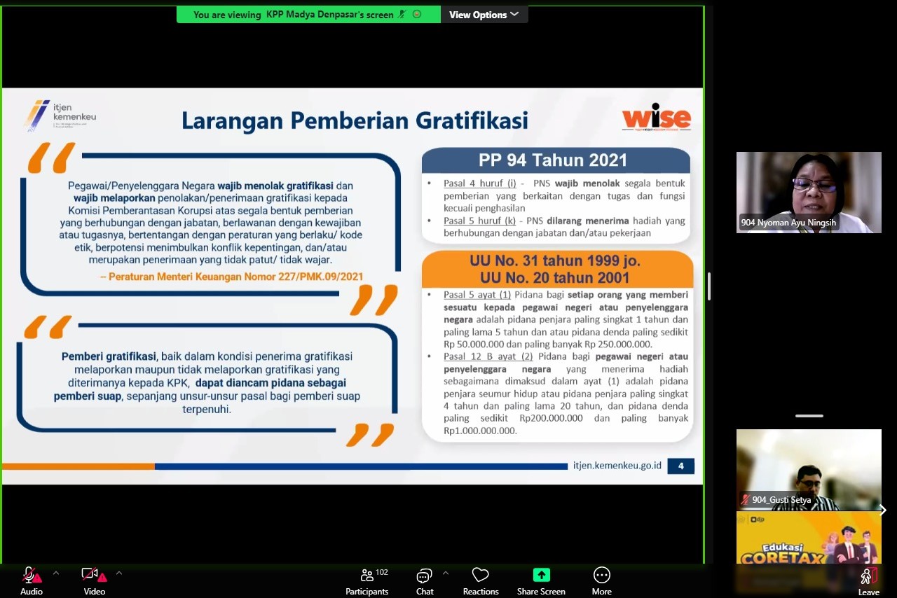 Kantor Pelayanan Pajak (KPP) Madya Denpasar kembali menggelar Sosialisasi Integritas dan Antikorupsi kepada wajib pajak sebagai salah satu upaya meningkatkan kepatuhan dan transparansi perpajakan. Kegiatan ini diadakan secara daring dan dihadiri lebih dari 100 peserta (Kamis, 6/3).